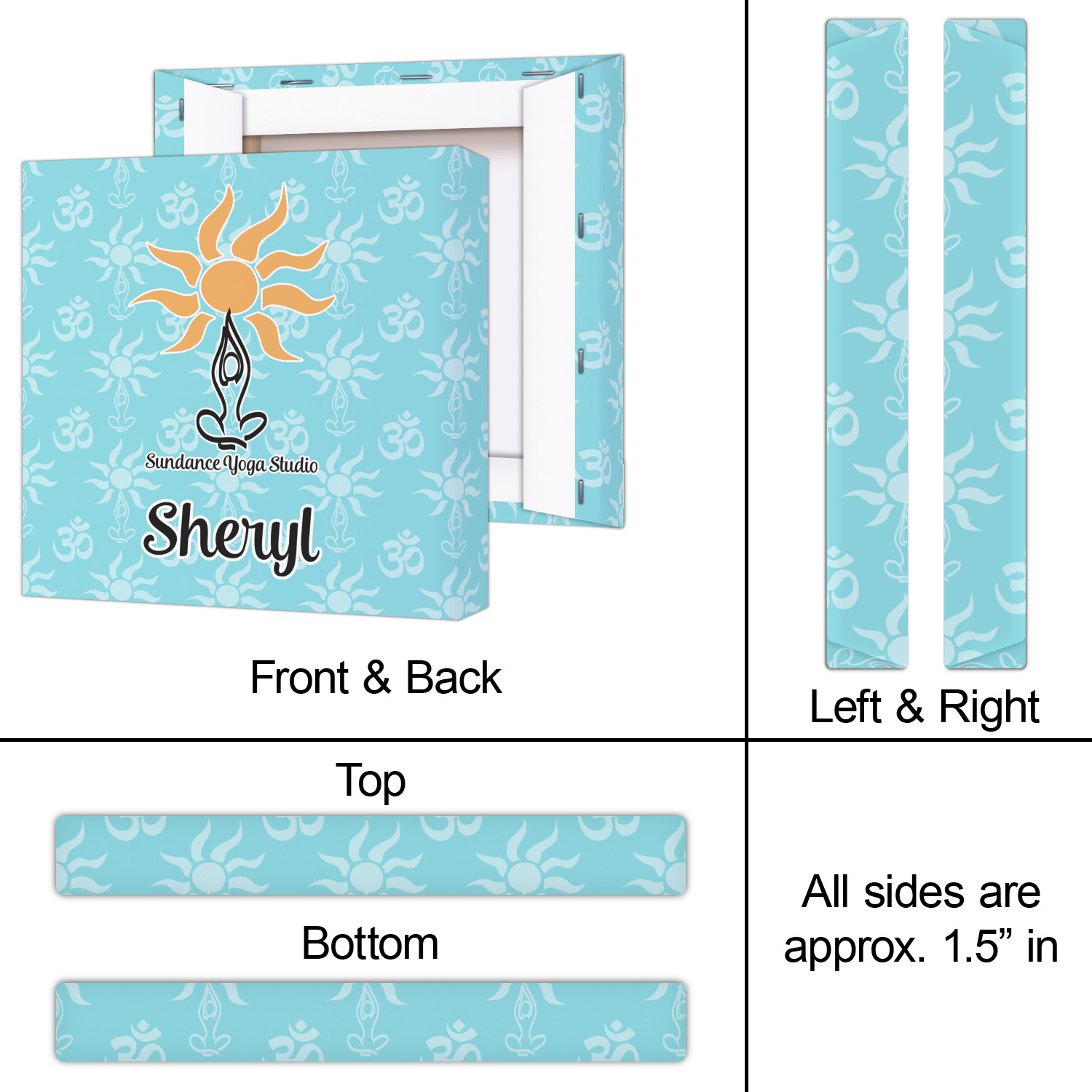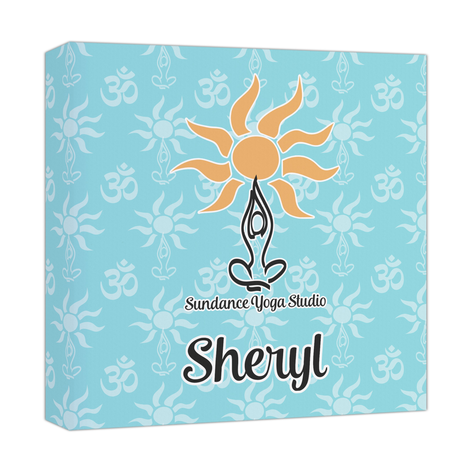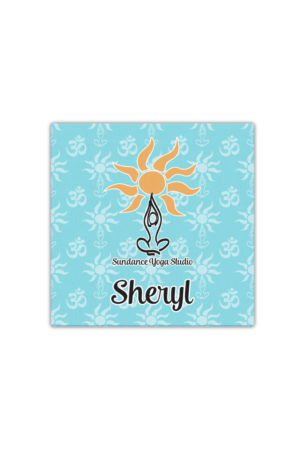 This calming design is dominantly a gorgeous light teal with the the Sundance logo, as well as the om symbol, repeating in the background. The main logo is prominently displayed front and center. The logo is a simple drawing of a figure doing the lotus pose with a sun rising above them. "Sundance Yoga Studio" is written beneath the logo. You personalization goes directly under the logo to create a finished design.