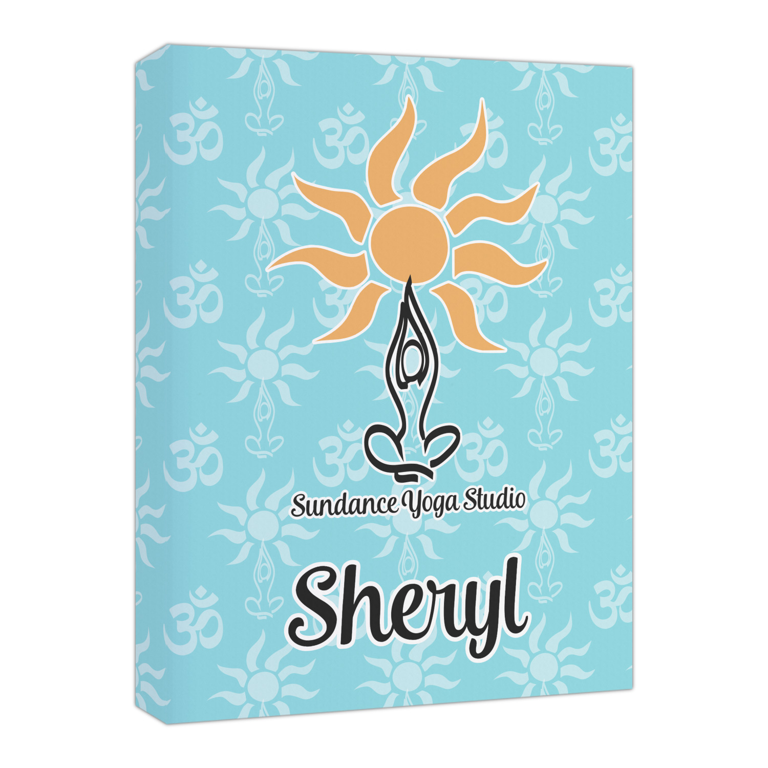 This calming design is dominantly a gorgeous light teal with the the Sundance logo, as well as the om symbol, repeating in the background. The main logo is prominently displayed front and center. The logo is a simple drawing of a figure doing the lotus pose with a sun rising above them. "Sundance Yoga Studio" is written beneath the logo. You personalization goes directly under the logo to create a finished design.