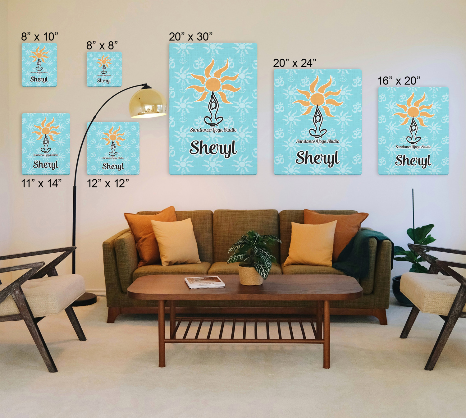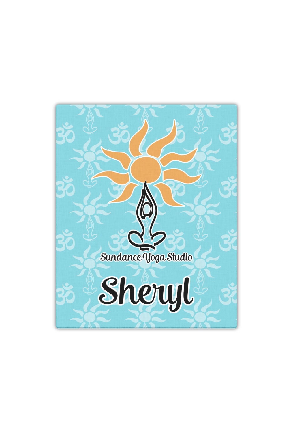 This calming design is dominantly a gorgeous light teal with the the Sundance logo, as well as the om symbol, repeating in the background. The main logo is prominently displayed front and center. The logo is a simple drawing of a figure doing the lotus pose with a sun rising above them. "Sundance Yoga Studio" is written beneath the logo. You personalization goes directly under the logo to create a finished design.