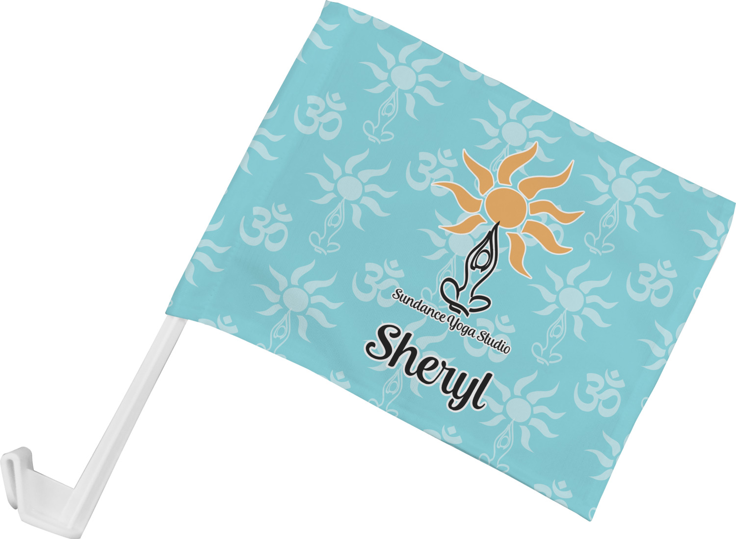 This calming design is dominantly a gorgeous light teal with the the Sundance logo, as well as the om symbol, repeating in the background. The main logo is prominently displayed front and center. The logo is a simple drawing of a figure doing the lotus pose with a sun rising above them. "Sundance Yoga Studio" is written beneath the logo. You personalization goes directly under the logo to create a finished design.