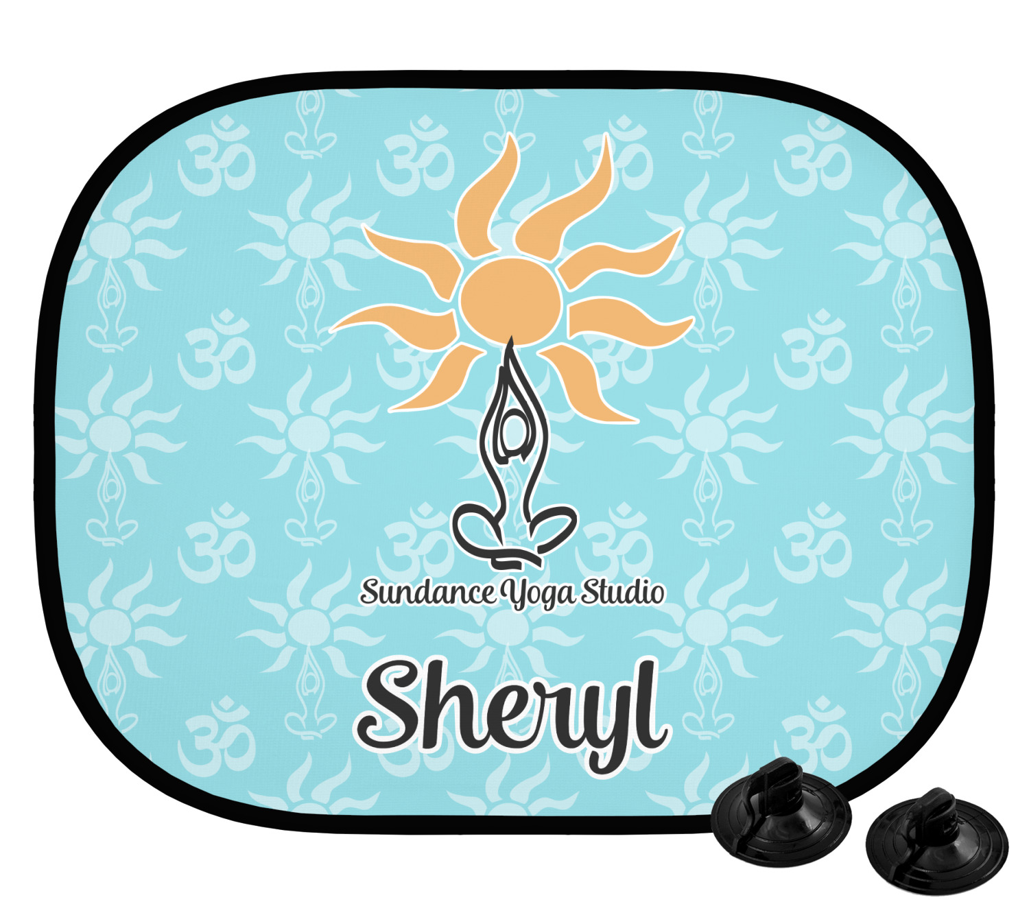 This calming design is dominantly a gorgeous light teal with the the Sundance logo, as well as the om symbol, repeating in the background. The main logo is prominently displayed front and center. The logo is a simple drawing of a figure doing the lotus pose with a sun rising above them. "Sundance Yoga Studio" is written beneath the logo. You personalization goes directly under the logo to create a finished design.