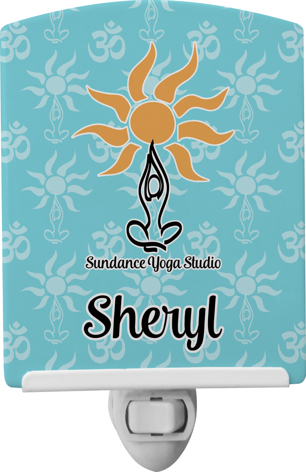 This calming design is dominantly a gorgeous light teal with the the Sundance logo, as well as the om symbol, repeating in the background. The main logo is prominently displayed front and center. The logo is a simple drawing of a figure doing the lotus pose with a sun rising above them. "Sundance Yoga Studio" is written beneath the logo. You personalization goes directly under the logo to create a finished design.