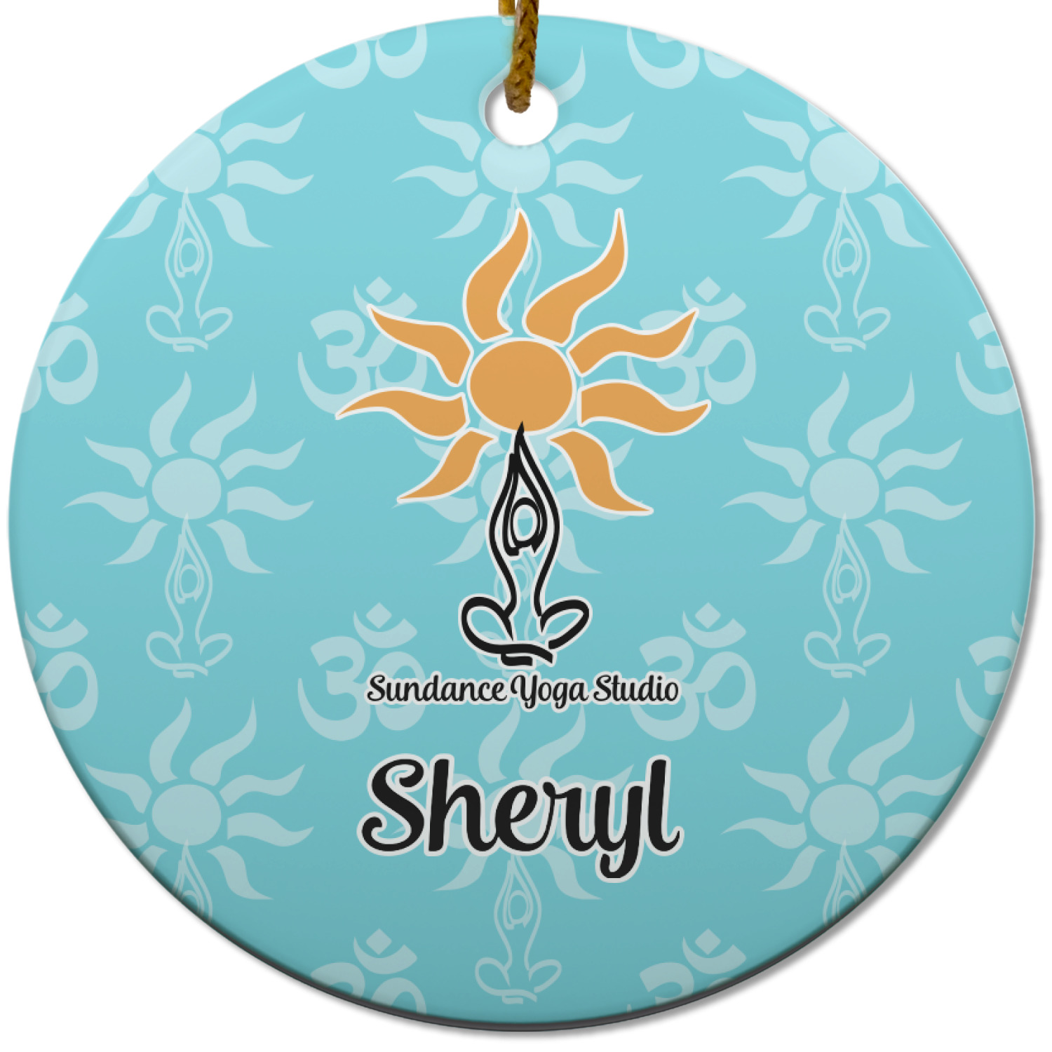 This calming design is dominantly a gorgeous light teal with the the Sundance logo, as well as the om symbol, repeating in the background. The main logo is prominently displayed front and center. The logo is a simple drawing of a figure doing the lotus pose with a sun rising above them. "Sundance Yoga Studio" is written beneath the logo. You personalization goes directly under the logo to create a finished design.