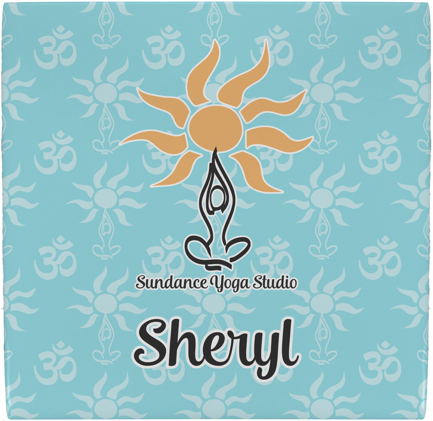 This calming design is dominantly a gorgeous light teal with the the Sundance logo, as well as the om symbol, repeating in the background. The main logo is prominently displayed front and center. The logo is a simple drawing of a figure doing the lotus pose with a sun rising above them. "Sundance Yoga Studio" is written beneath the logo. You personalization goes directly under the logo to create a finished design.
