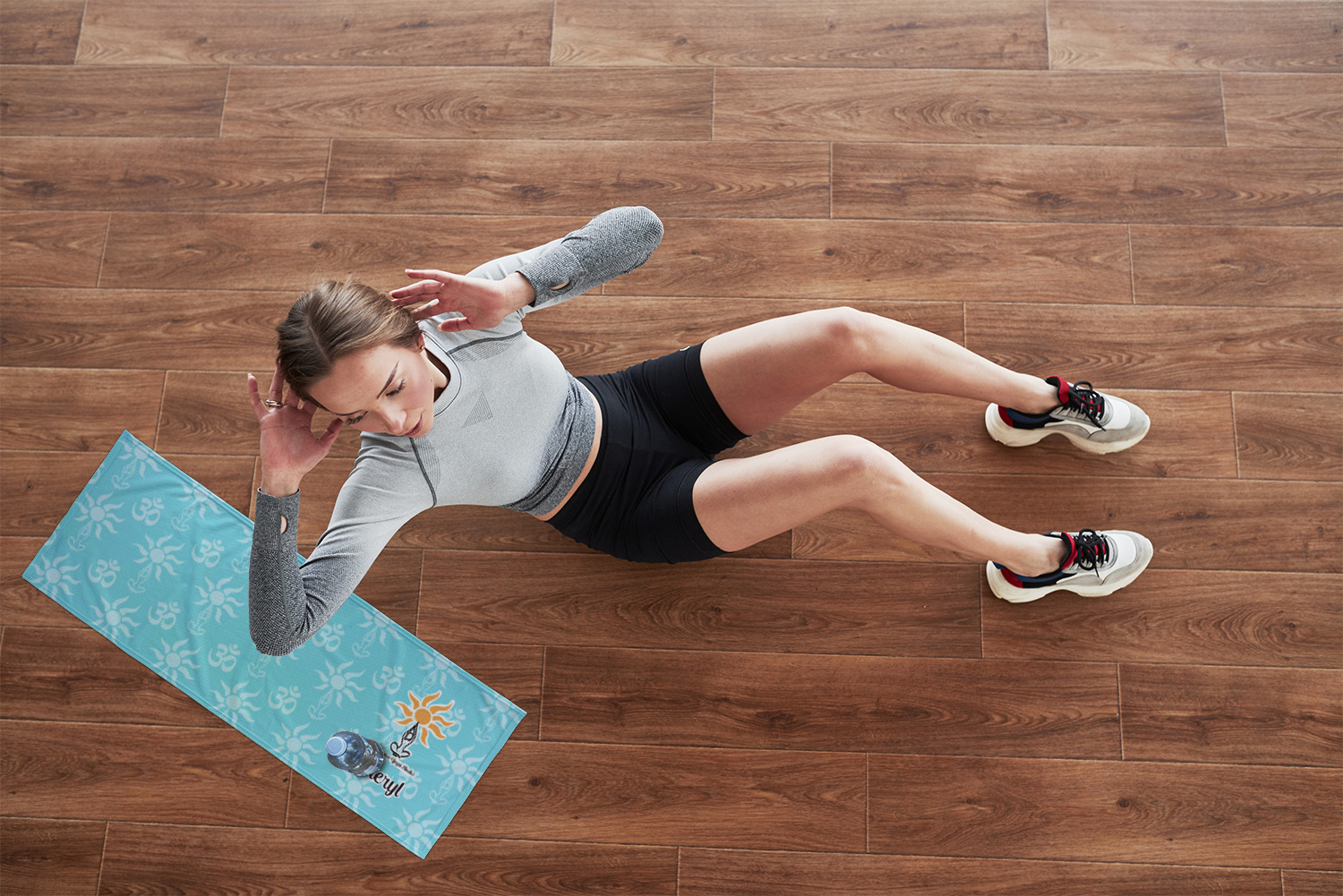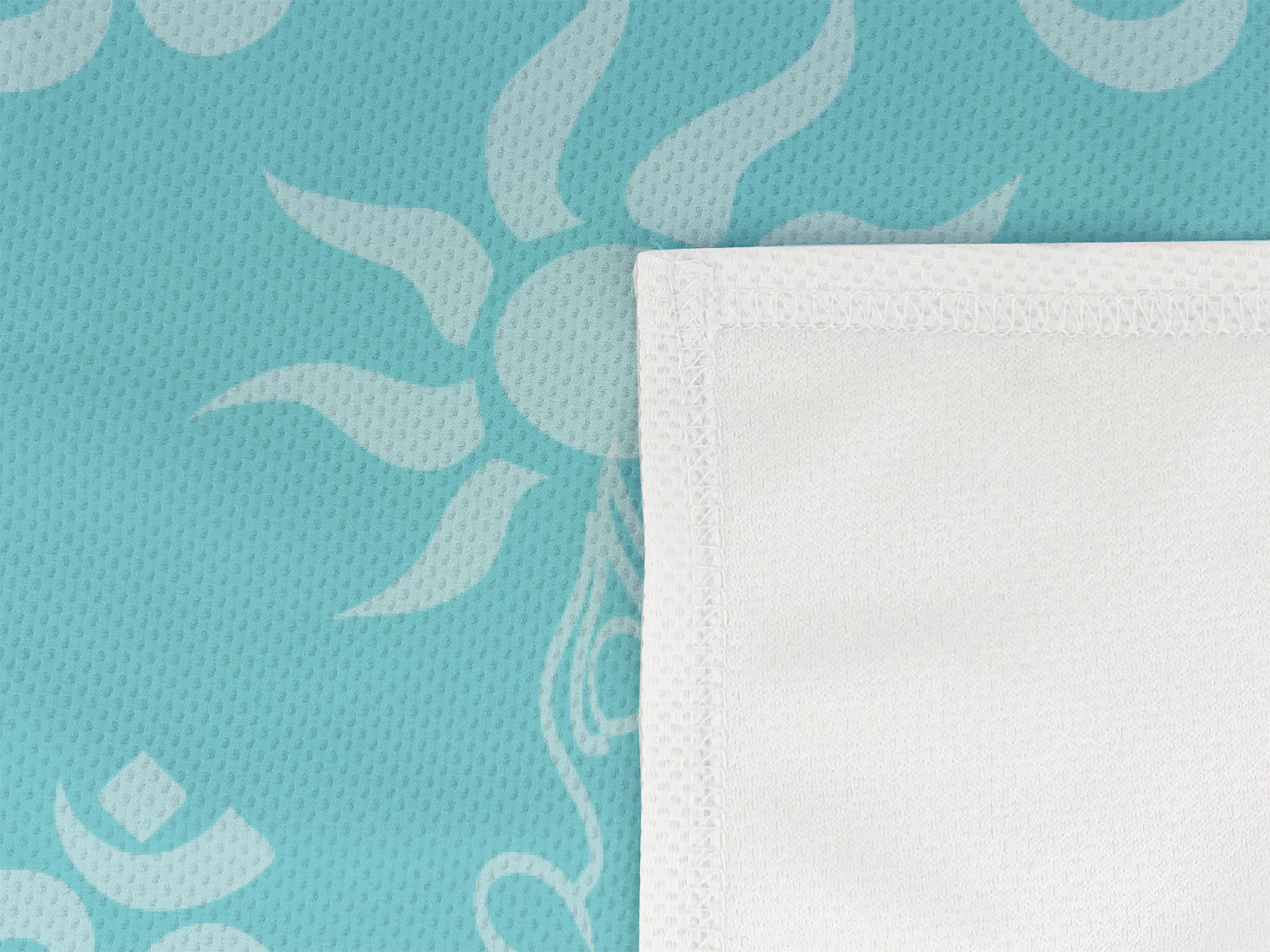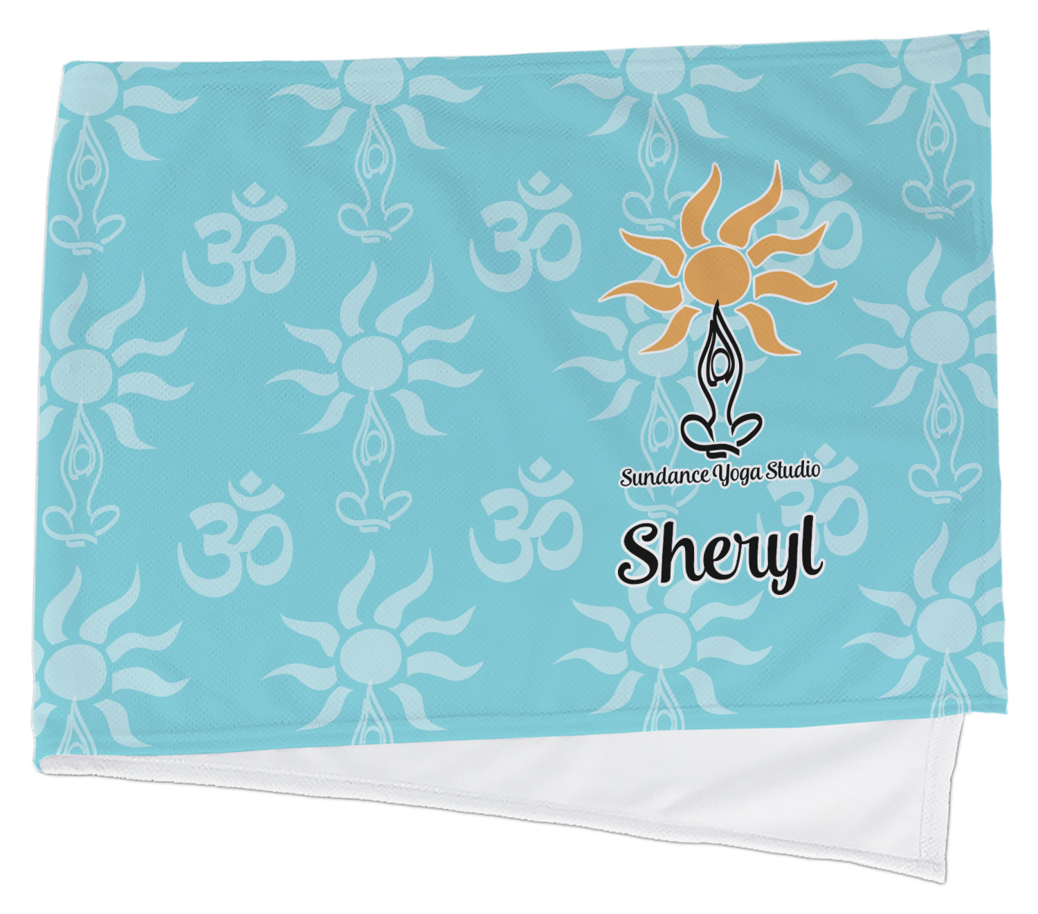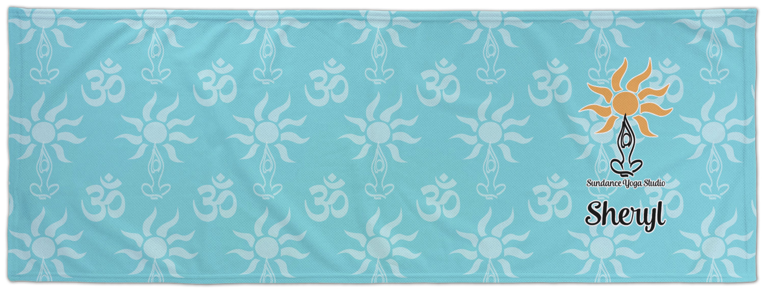 This calming design is dominantly a gorgeous light teal with the the Sundance logo, as well as the om symbol, repeating in the background. The main logo is prominently displayed front and center. The logo is a simple drawing of a figure doing the lotus pose with a sun rising above them. "Sundance Yoga Studio" is written beneath the logo. You personalization goes directly under the logo to create a finished design.