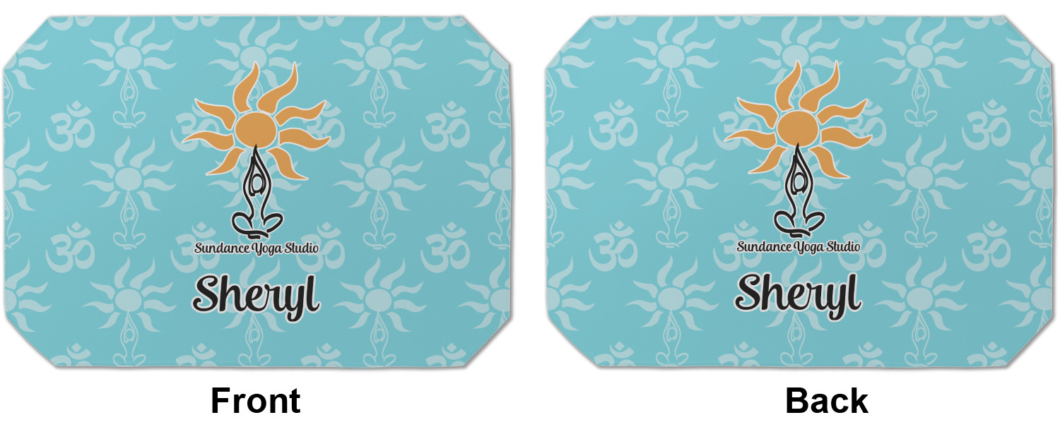 This calming design is dominantly a gorgeous light teal with the the Sundance logo, as well as the om symbol, repeating in the background. The main logo is prominently displayed front and center. The logo is a simple drawing of a figure doing the lotus pose with a sun rising above them. "Sundance Yoga Studio" is written beneath the logo. You personalization goes directly under the logo to create a finished design.