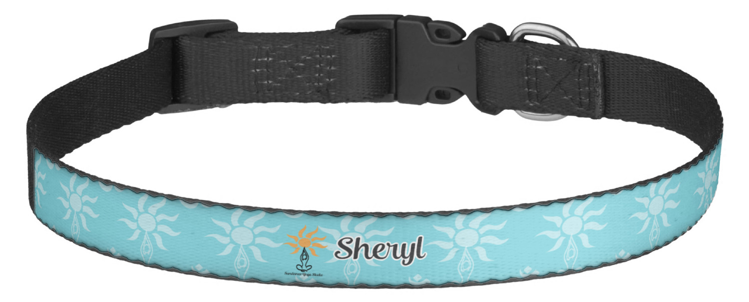 This sturdy collar, made from a durable nylon weave, will outlive your dog's episodes of excited tugging and pulling. Courtesy of its thick plastic buckle and adjuster, this collar is adjustable and accommodating of any dog. Structurally, the collar is a single piece of nylon weave that is sewn together, and features a solid metal loop where you can attach a leash or dog tag. We print and display your dog's name and pattern across the middle of the personalized dog collar.