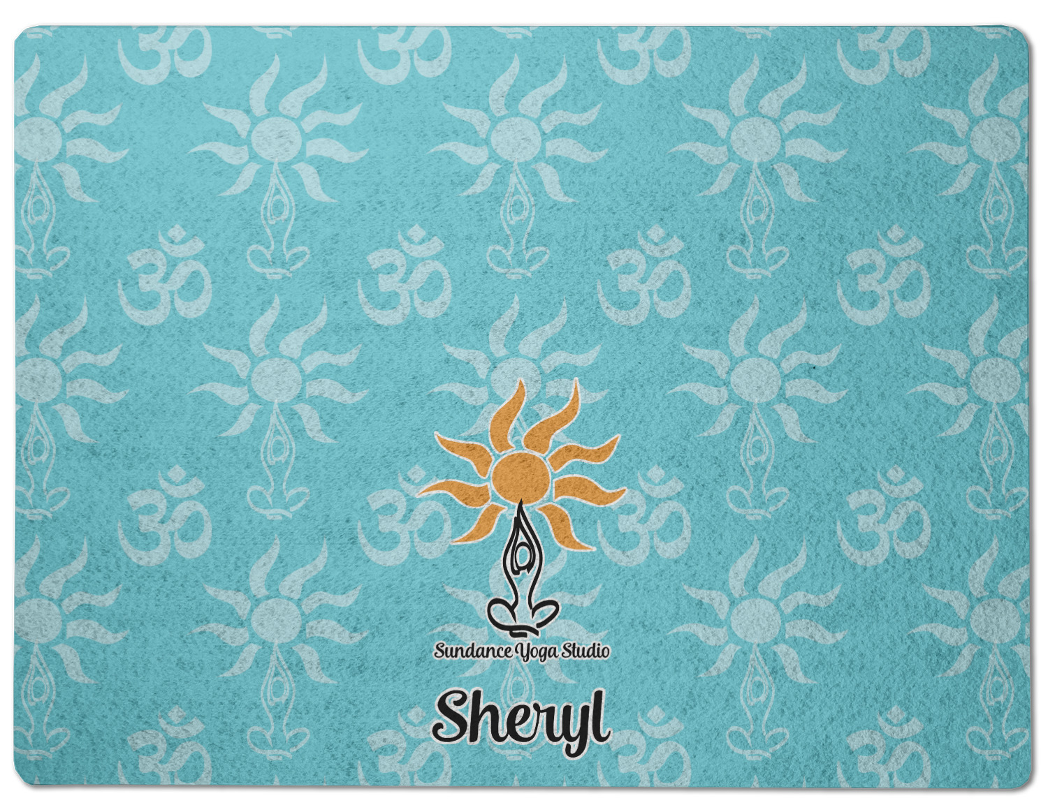 This calming design is dominantly a gorgeous light teal with the the Sundance logo, as well as the om symbol, repeating in the background. The main logo is prominently displayed front and center. The logo is a simple drawing of a figure doing the lotus pose with a sun rising above them. "Sundance Yoga Studio" is written beneath the logo. You personalization goes directly under the logo to create a finished design.