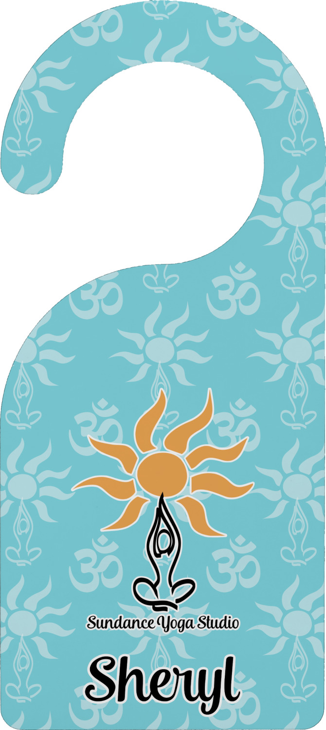 This calming design is dominantly a gorgeous light teal with the the Sundance logo, as well as the om symbol, repeating in the background. The main logo is prominently displayed front and center. The logo is a simple drawing of a figure doing the lotus pose with a sun rising above them. "Sundance Yoga Studio" is written beneath the logo. You personalization goes directly under the logo to create a finished design.