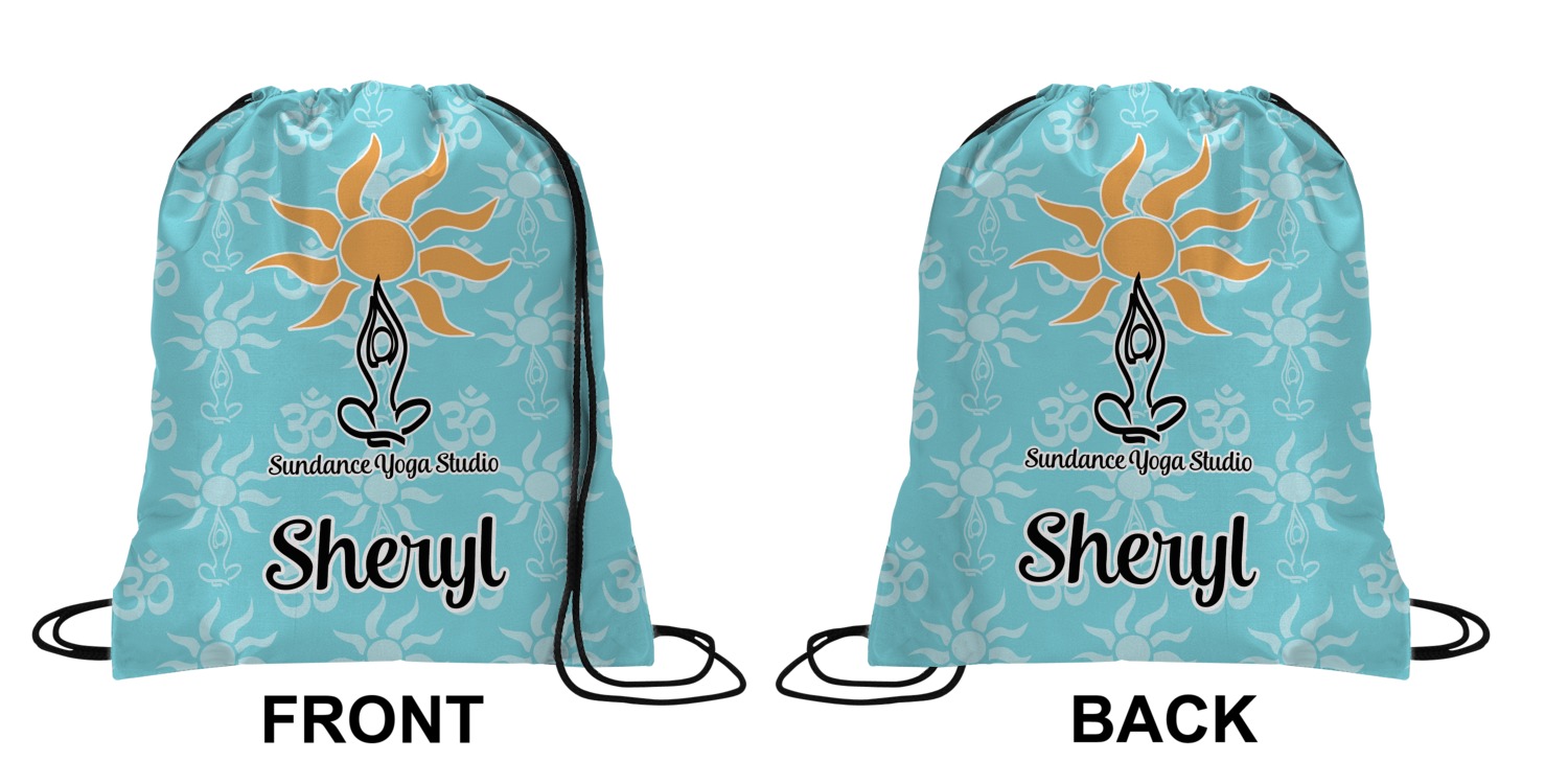 Your custom design will appear on the front and the back of the backpack. You can customize each side individually. The inside of the backpack is white and the drawstrings are black. The back pack is made of 100% polyester fabric.