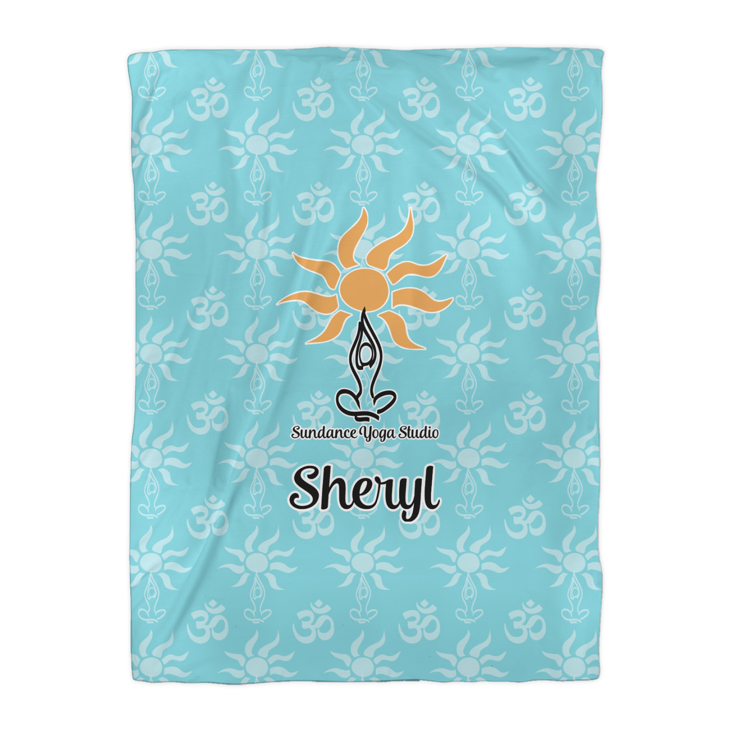 This calming design is dominantly a gorgeous light teal with the the Sundance logo, as well as the om symbol, repeating in the background. The main logo is prominently displayed front and center. The logo is a simple drawing of a figure doing the lotus pose with a sun rising above them. "Sundance Yoga Studio" is written beneath the logo. You personalization goes directly under the logo to create a finished design.