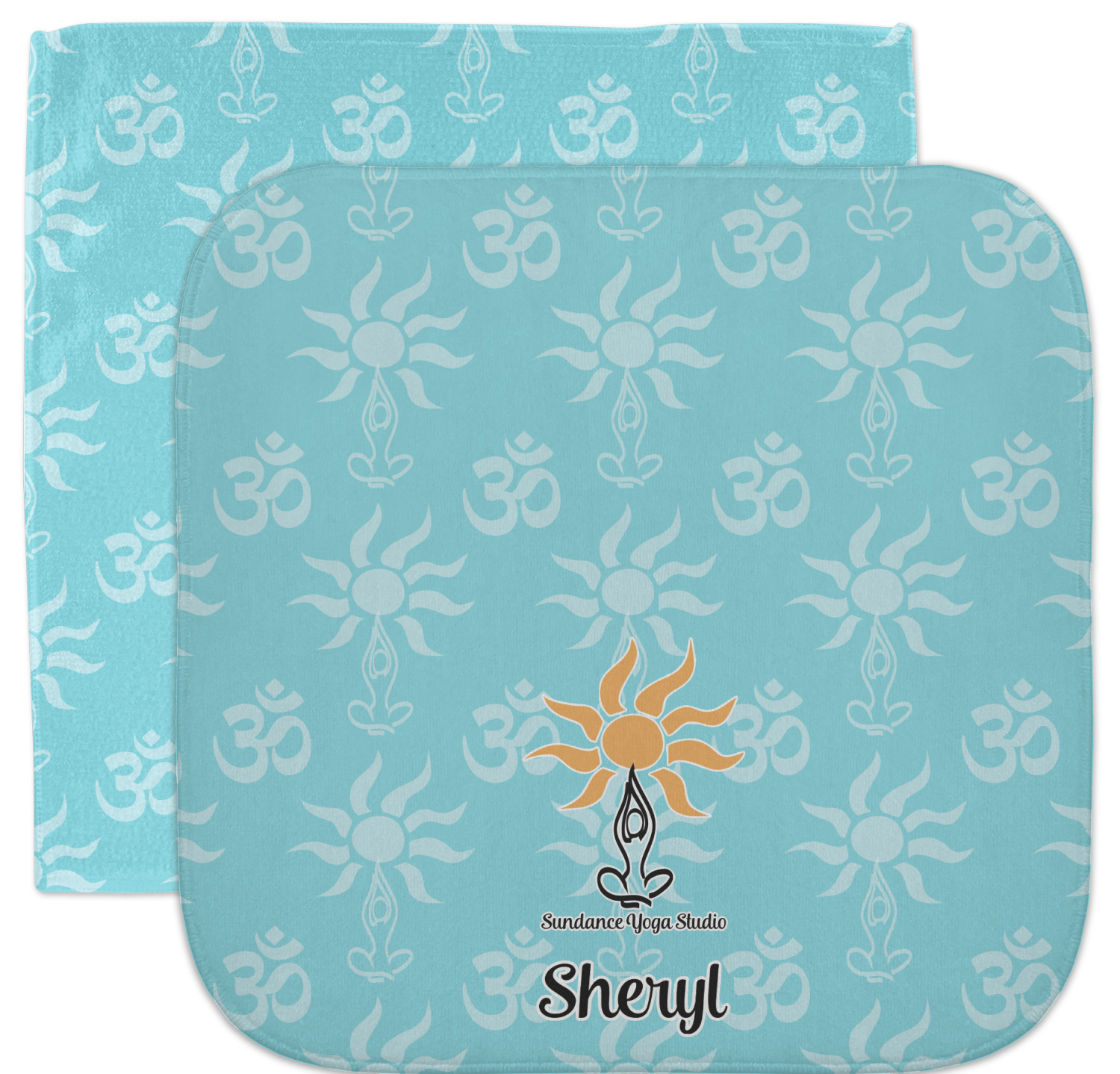 This calming design is dominantly a gorgeous light teal with the the Sundance logo, as well as the om symbol, repeating in the background. The main logo is prominently displayed front and center. The logo is a simple drawing of a figure doing the lotus pose with a sun rising above them. "Sundance Yoga Studio" is written beneath the logo. You personalization goes directly under the logo to create a finished design.