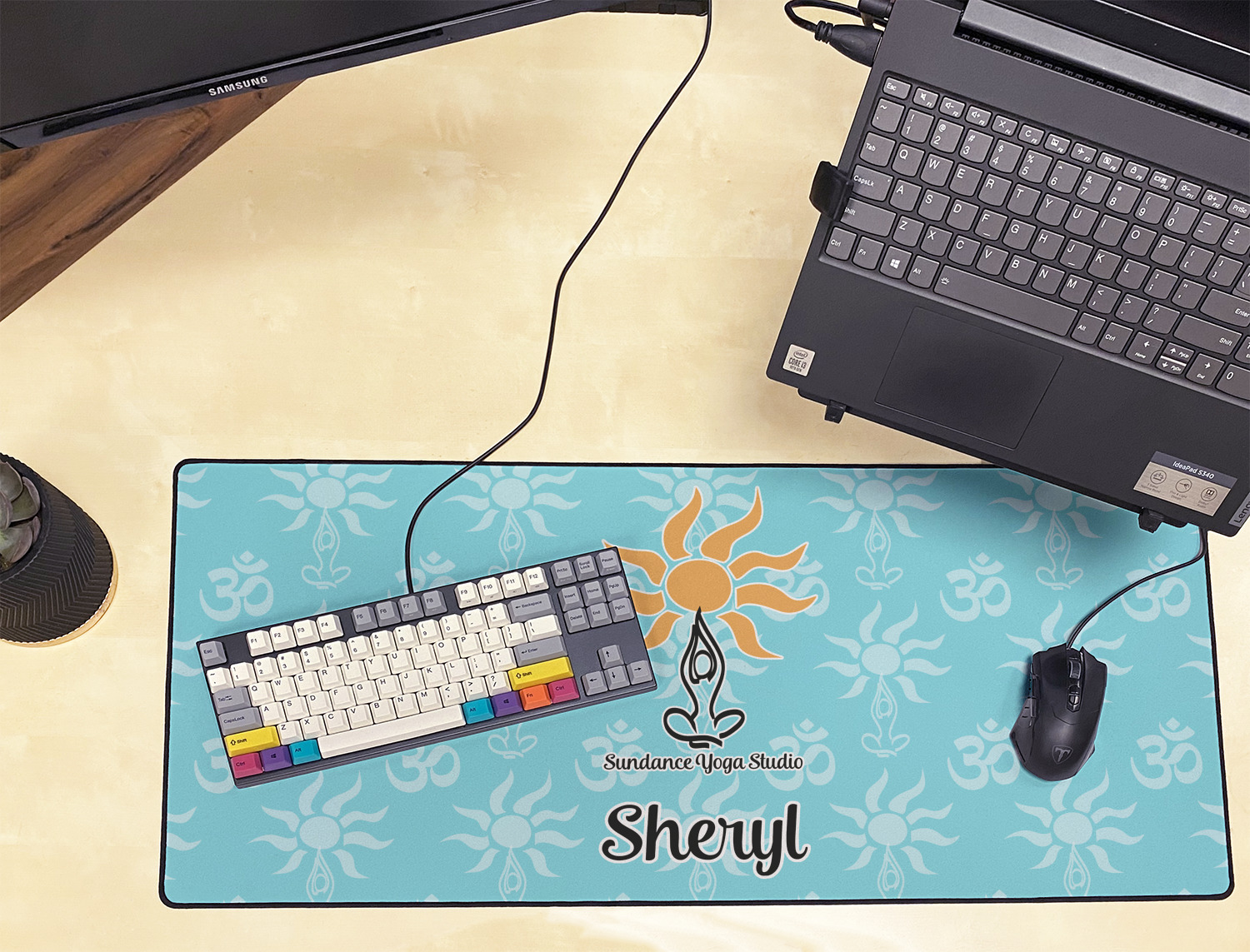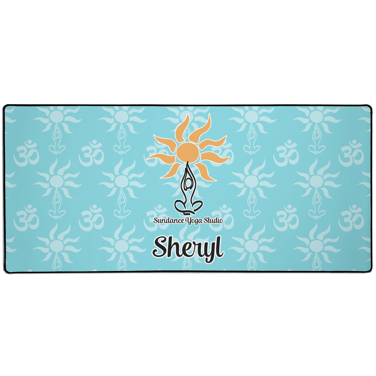This calming design is dominantly a gorgeous light teal with the the Sundance logo, as well as the om symbol, repeating in the background. The main logo is prominently displayed front and center. The logo is a simple drawing of a figure doing the lotus pose with a sun rising above them. "Sundance Yoga Studio" is written beneath the logo. You personalization goes directly under the logo to create a finished design.