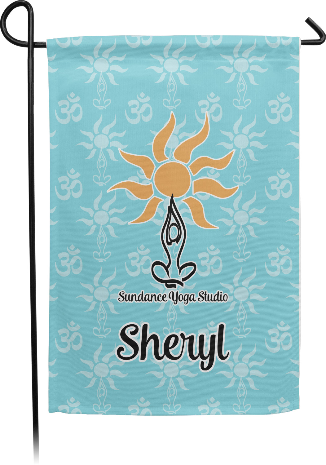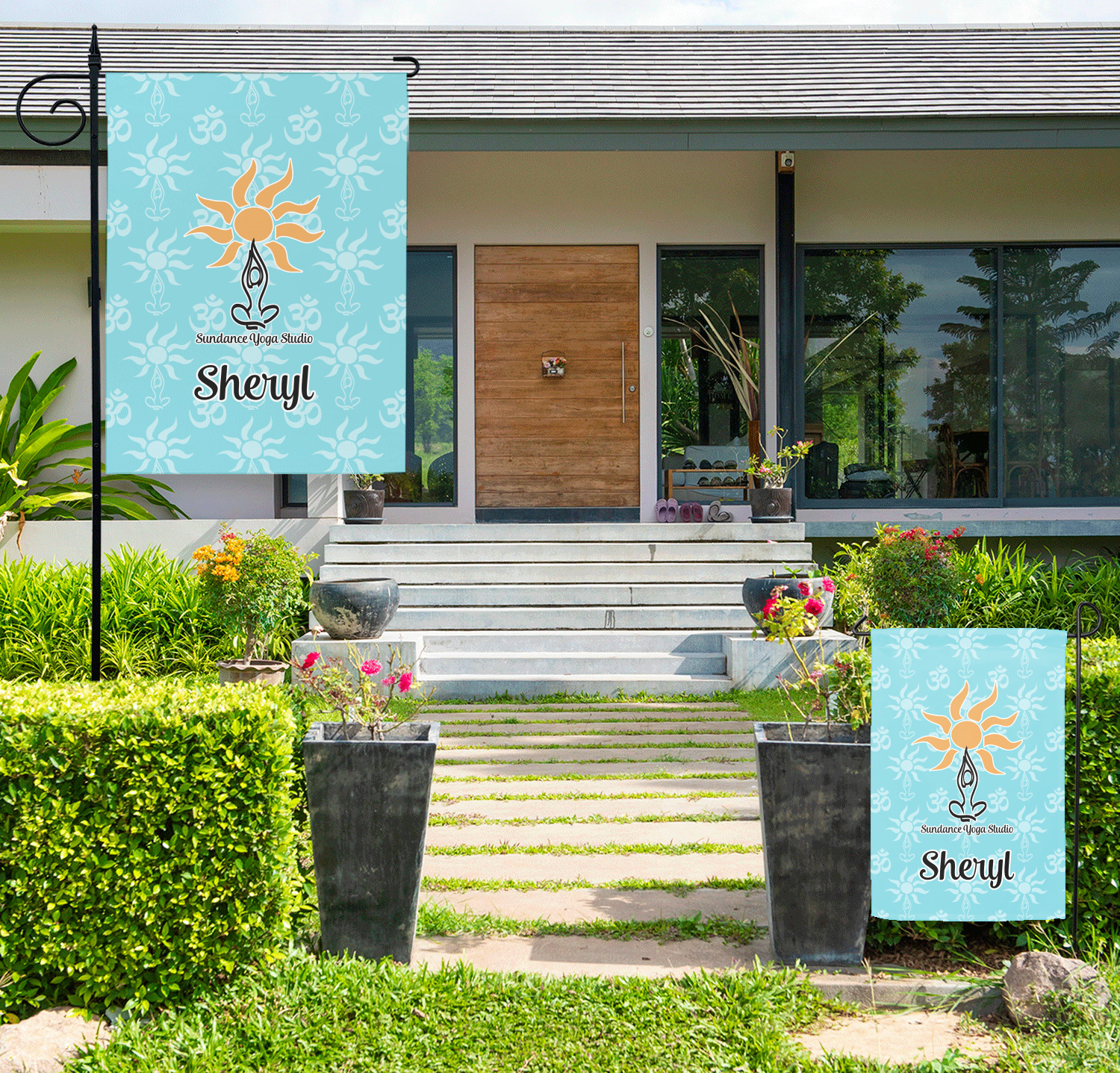 This calming design is dominantly a gorgeous light teal with the the Sundance logo, as well as the om symbol, repeating in the background. The main logo is prominently displayed front and center. The logo is a simple drawing of a figure doing the lotus pose with a sun rising above them. "Sundance Yoga Studio" is written beneath the logo. You personalization goes directly under the logo to create a finished design.