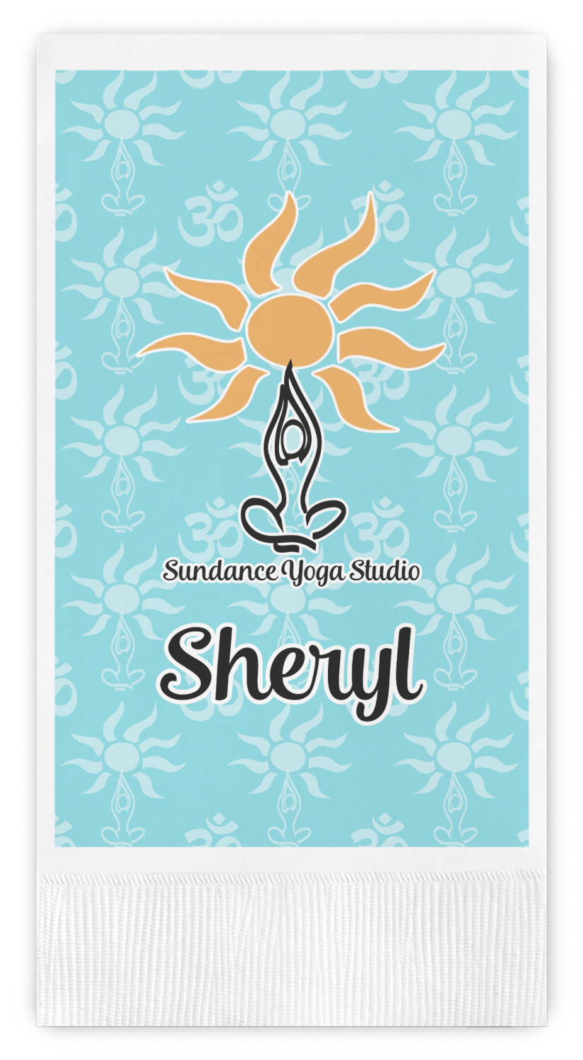 This calming design is dominantly a gorgeous light teal with the the Sundance logo, as well as the om symbol, repeating in the background. The main logo is prominently displayed front and center. The logo is a simple drawing of a figure doing the lotus pose with a sun rising above them. "Sundance Yoga Studio" is written beneath the logo. You personalization goes directly under the logo to create a finished design.
