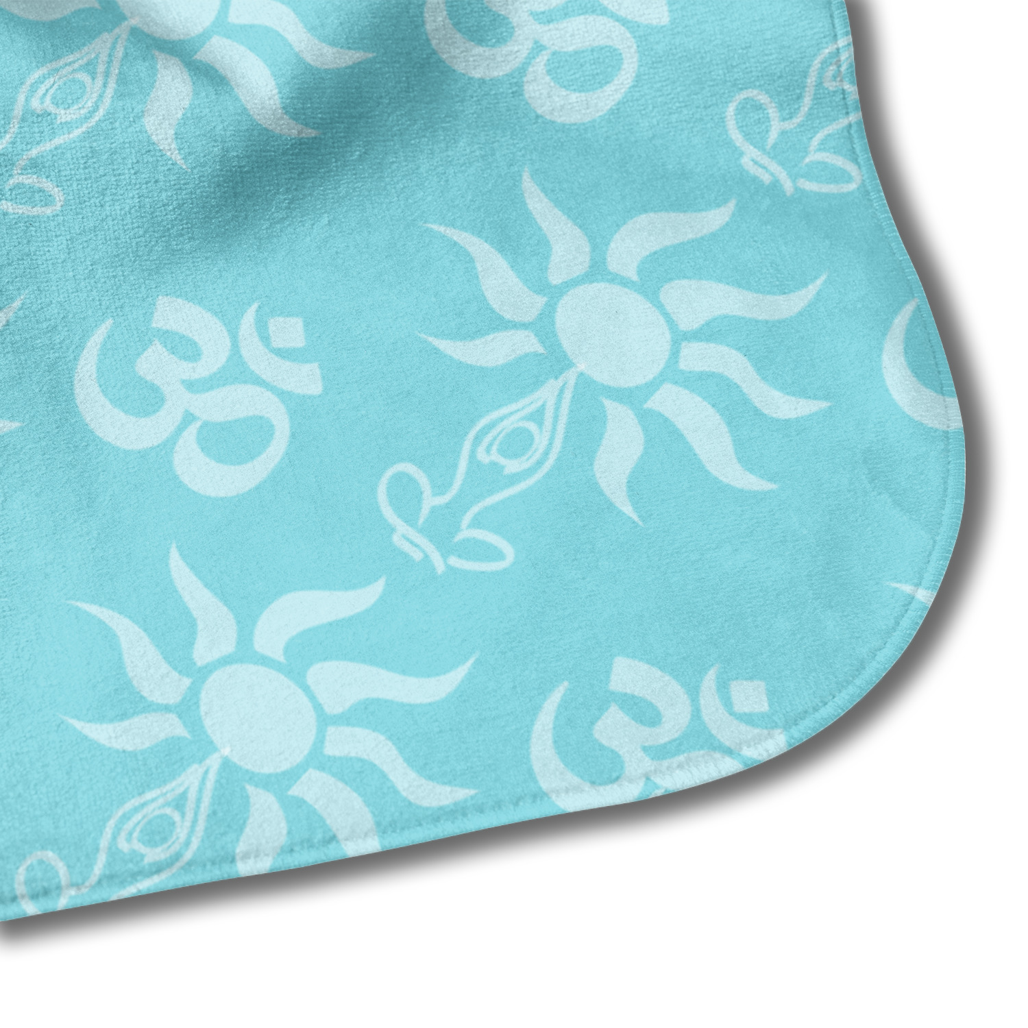 This calming design is dominantly a gorgeous light teal with the the Sundance logo, as well as the om symbol, repeating in the background. The main logo is prominently displayed front and center. The logo is a simple drawing of a figure doing the lotus pose with a sun rising above them. "Sundance Yoga Studio" is written beneath the logo. You personalization goes directly under the logo to create a finished design.
