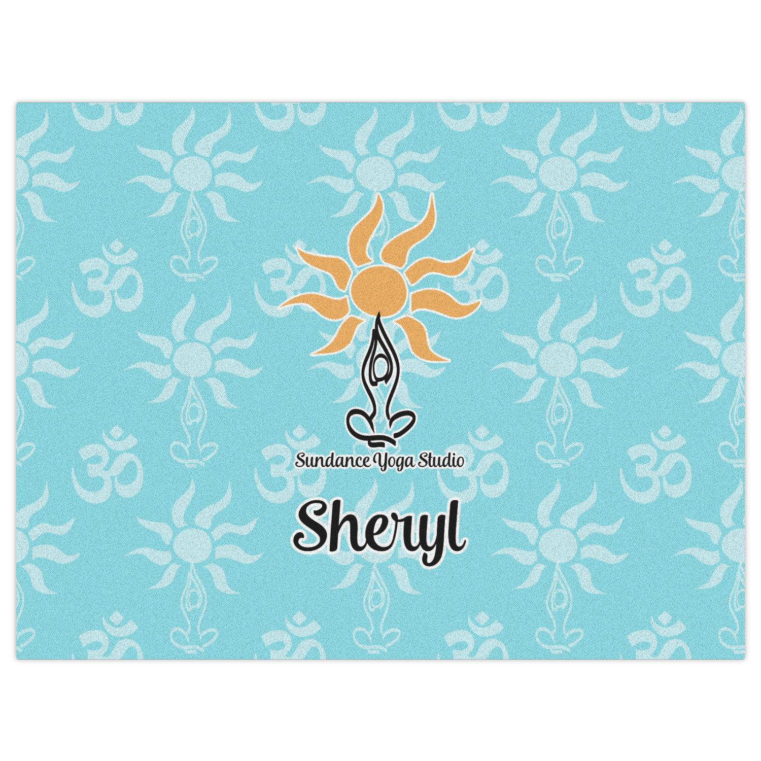 This calming design is dominantly a gorgeous light teal with the the Sundance logo, as well as the om symbol, repeating in the background. The main logo is prominently displayed front and center. The logo is a simple drawing of a figure doing the lotus pose with a sun rising above them. "Sundance Yoga Studio" is written beneath the logo. You personalization goes directly under the logo to create a finished design.