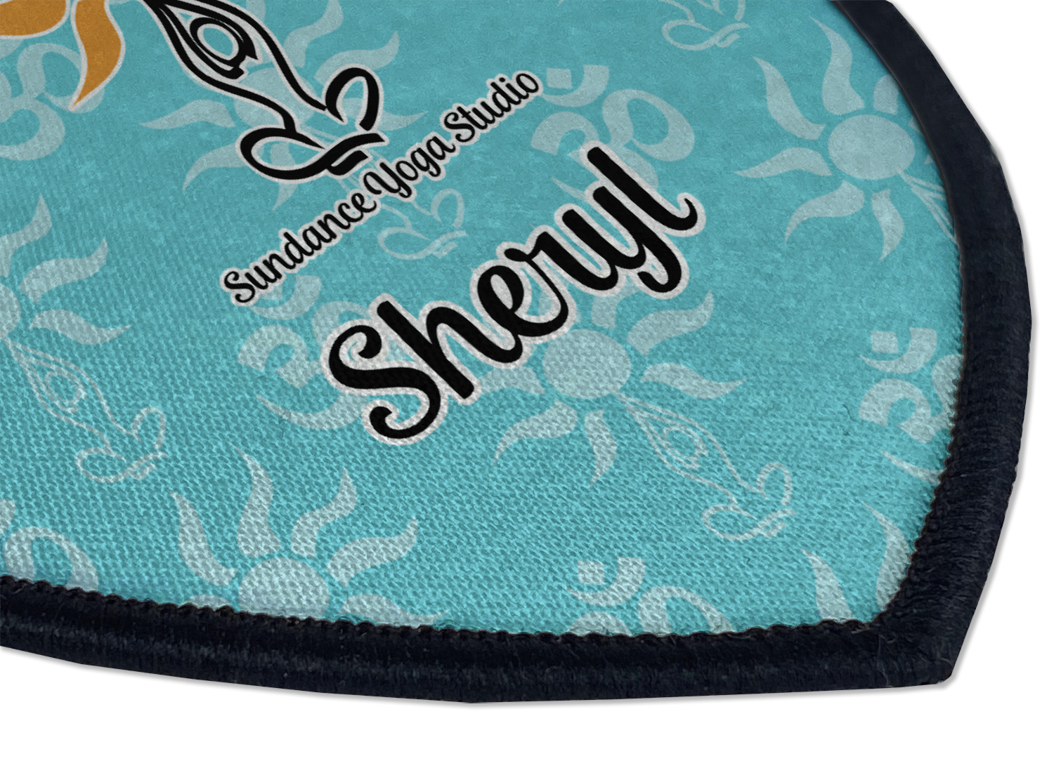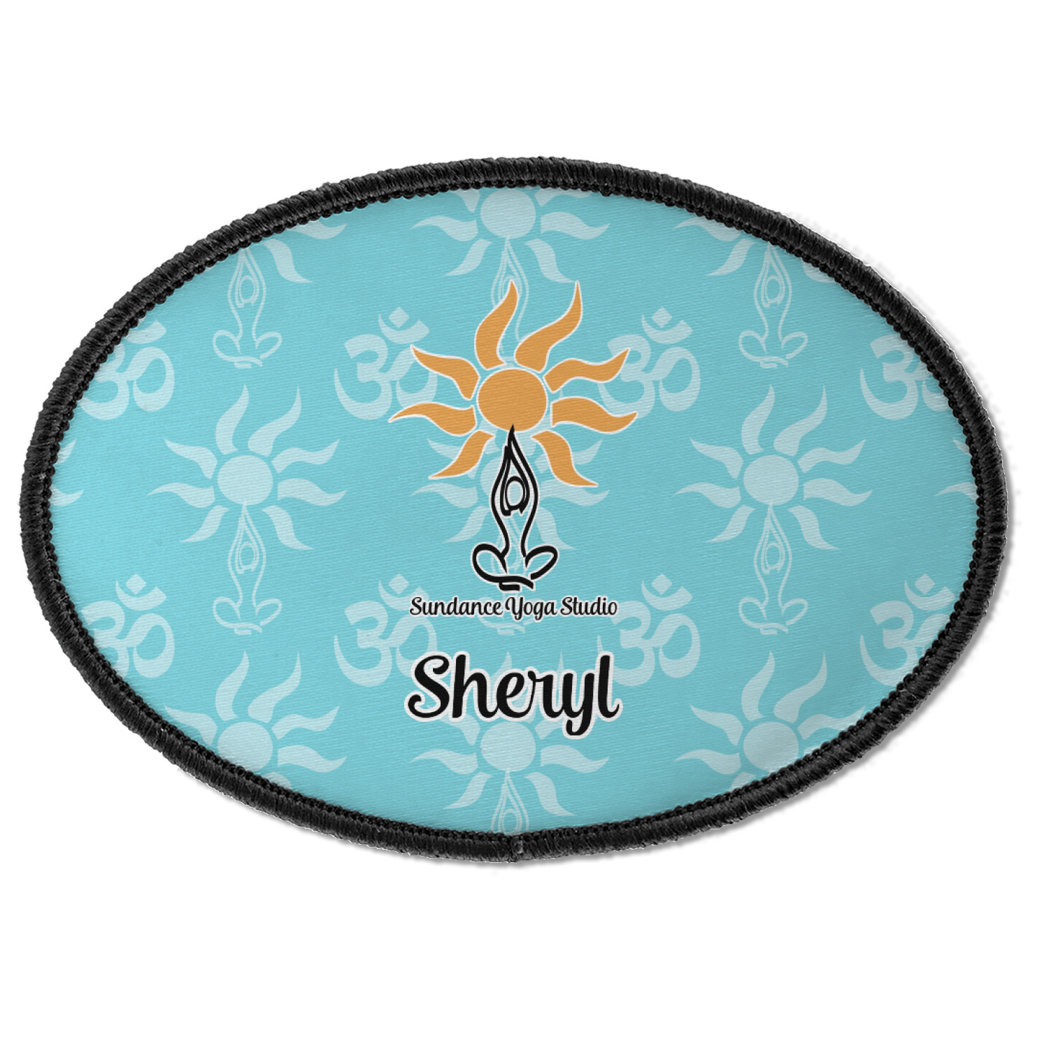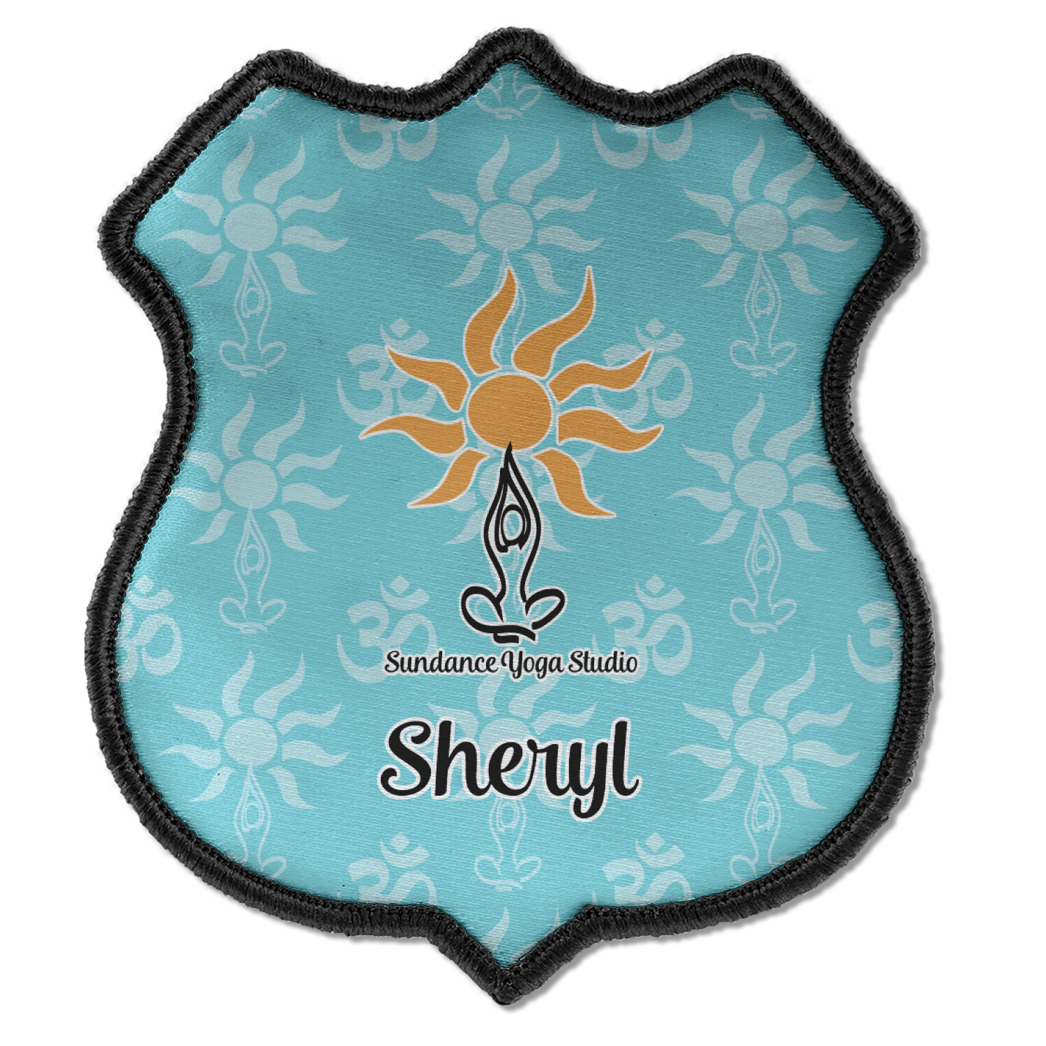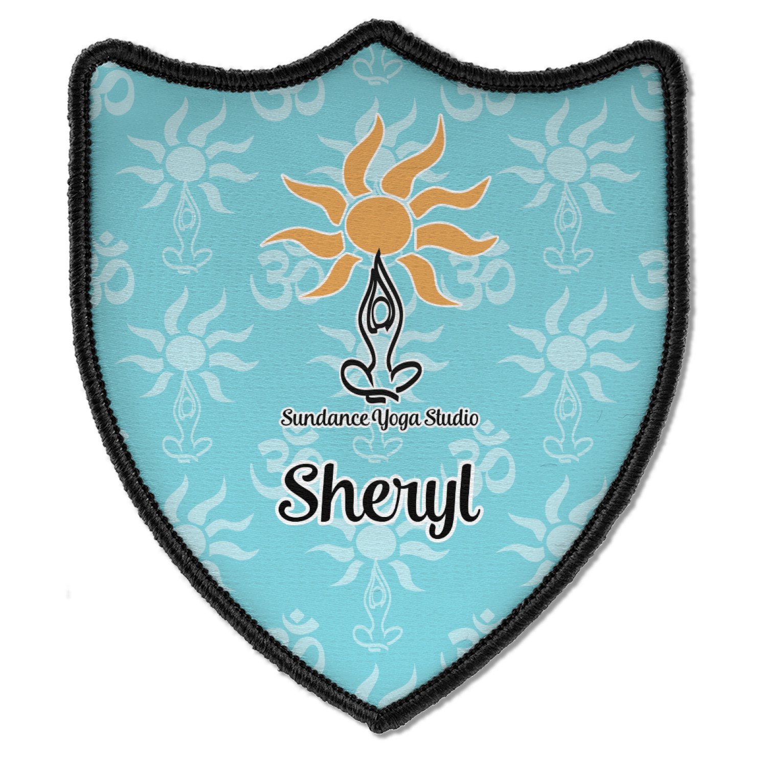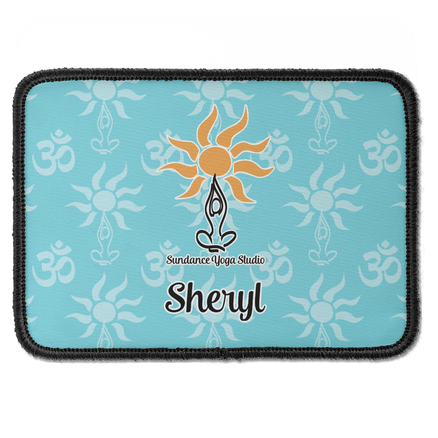 This calming design is dominantly a gorgeous light teal with the the Sundance logo, as well as the om symbol, repeating in the background. The main logo is prominently displayed front and center. The logo is a simple drawing of a figure doing the lotus pose with a sun rising above them. "Sundance Yoga Studio" is written beneath the logo. You personalization goes directly under the logo to create a finished design.