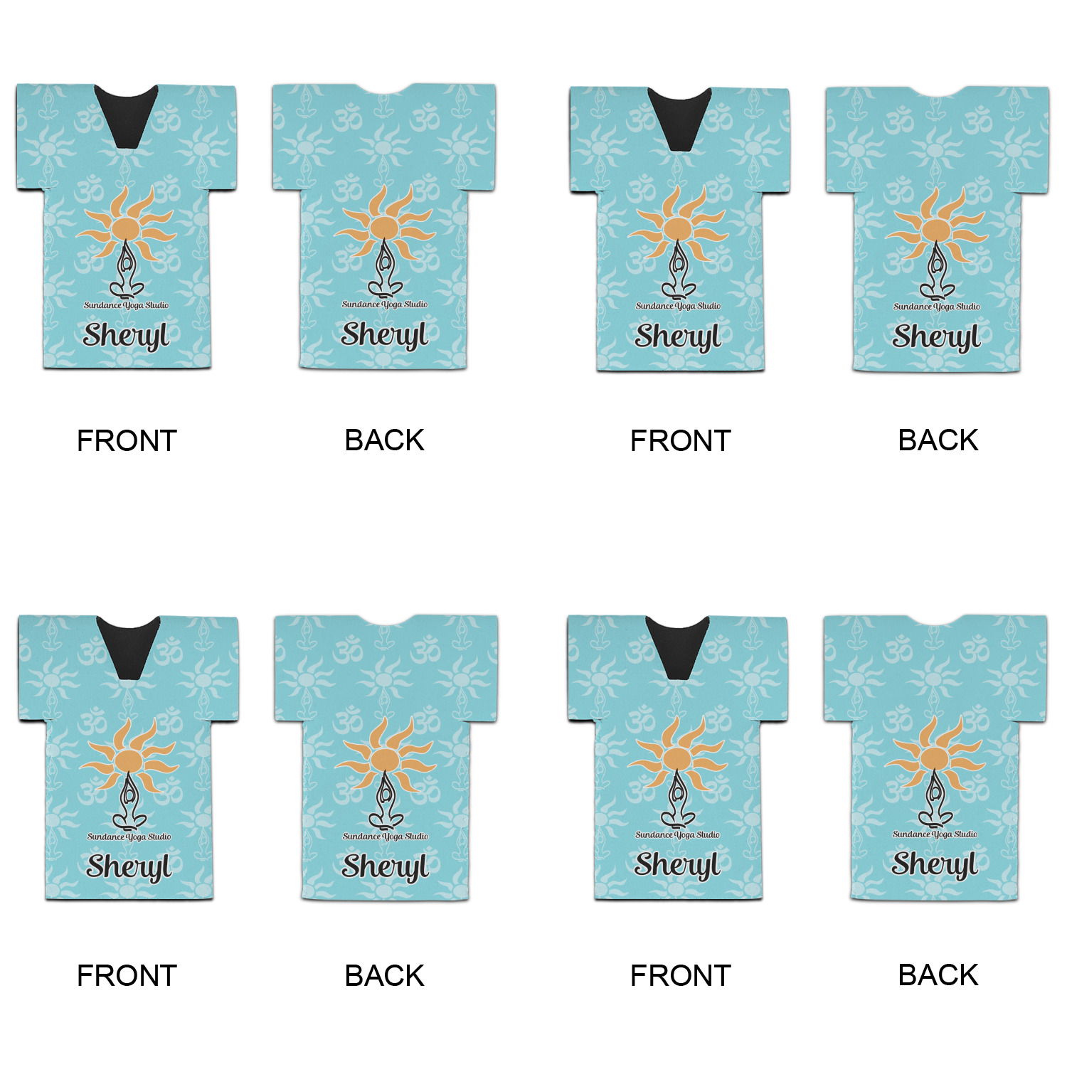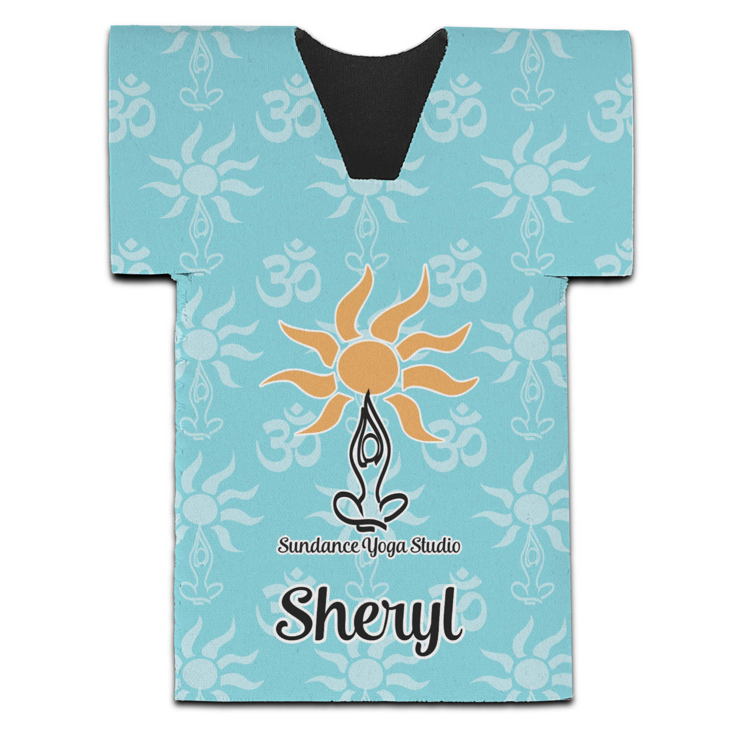 This calming design is dominantly a gorgeous light teal with the the Sundance logo, as well as the om symbol, repeating in the background. The main logo is prominently displayed front and center. The logo is a simple drawing of a figure doing the lotus pose with a sun rising above them. "Sundance Yoga Studio" is written beneath the logo. You personalization goes directly under the logo to create a finished design.