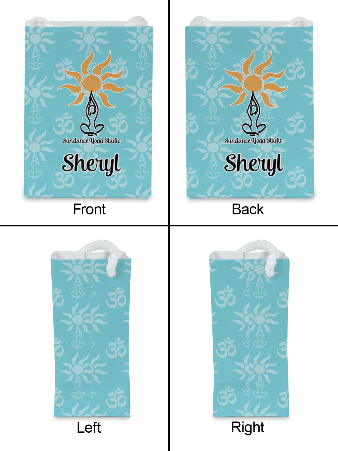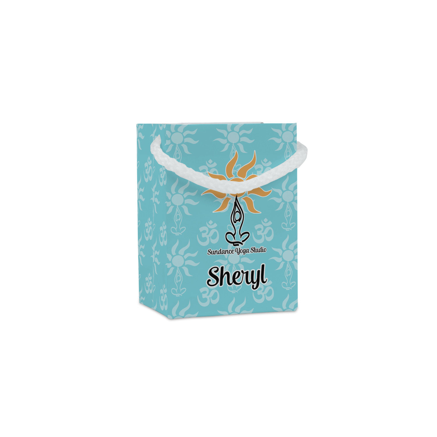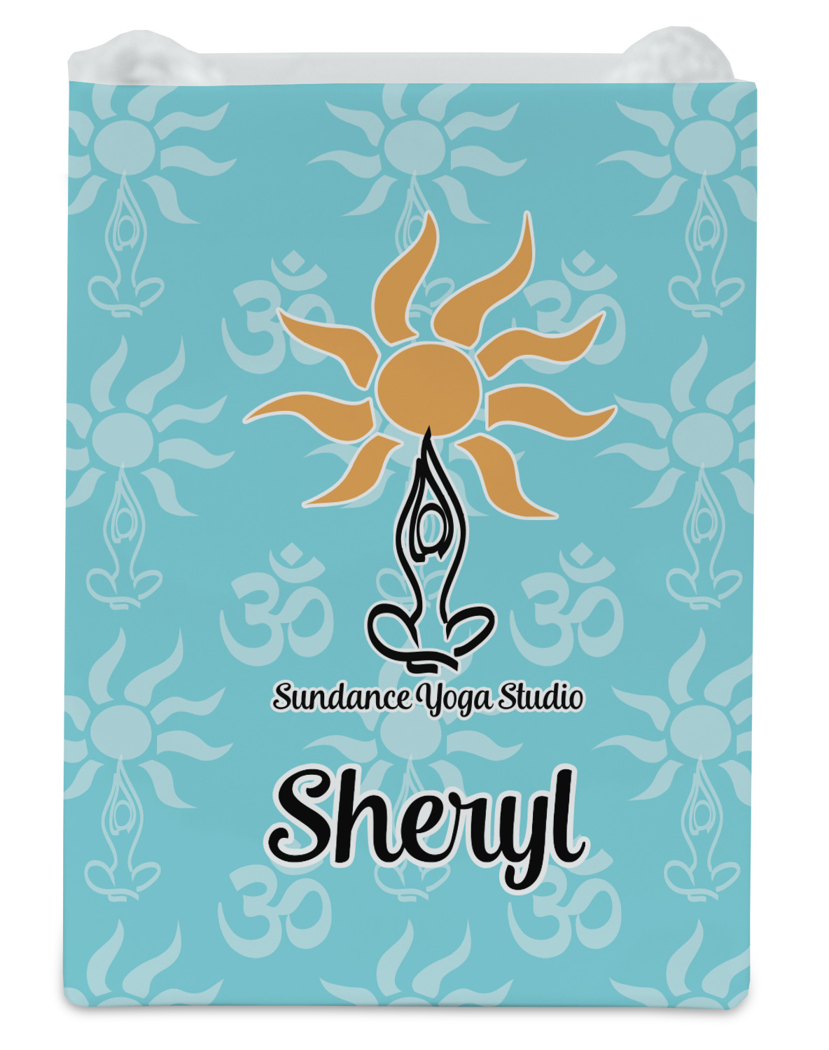 This calming design is dominantly a gorgeous light teal with the the Sundance logo, as well as the om symbol, repeating in the background. The main logo is prominently displayed front and center. The logo is a simple drawing of a figure doing the lotus pose with a sun rising above them. "Sundance Yoga Studio" is written beneath the logo. You personalization goes directly under the logo to create a finished design.