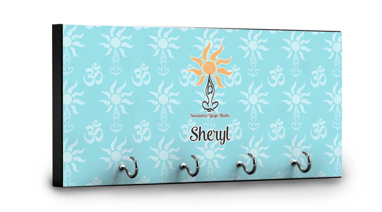 This calming design is dominantly a gorgeous light teal with the the Sundance logo, as well as the om symbol, repeating in the background. The main logo is prominently displayed front and center. The logo is a simple drawing of a figure doing the lotus pose with a sun rising above them. "Sundance Yoga Studio" is written beneath the logo. You personalization goes directly under the logo to create a finished design.