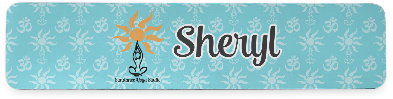 This calming design is dominantly a gorgeous light teal with the the Sundance logo, as well as the om symbol, repeating in the background. The main logo is prominently displayed front and center. The logo is a simple drawing of a figure doing the lotus pose with a sun rising above them. "Sundance Yoga Studio" is written beneath the logo. You personalization goes directly under the logo to create a finished design.