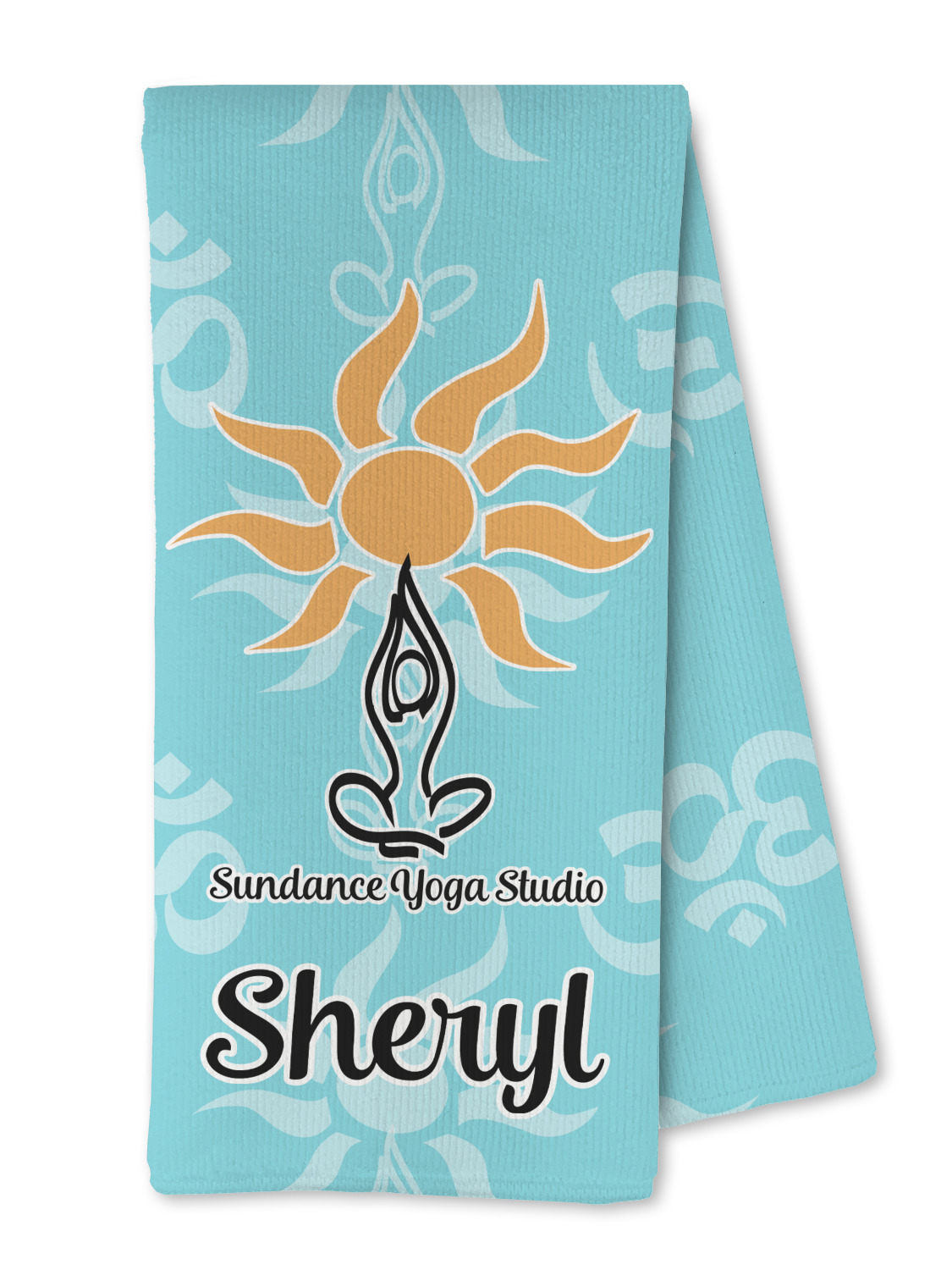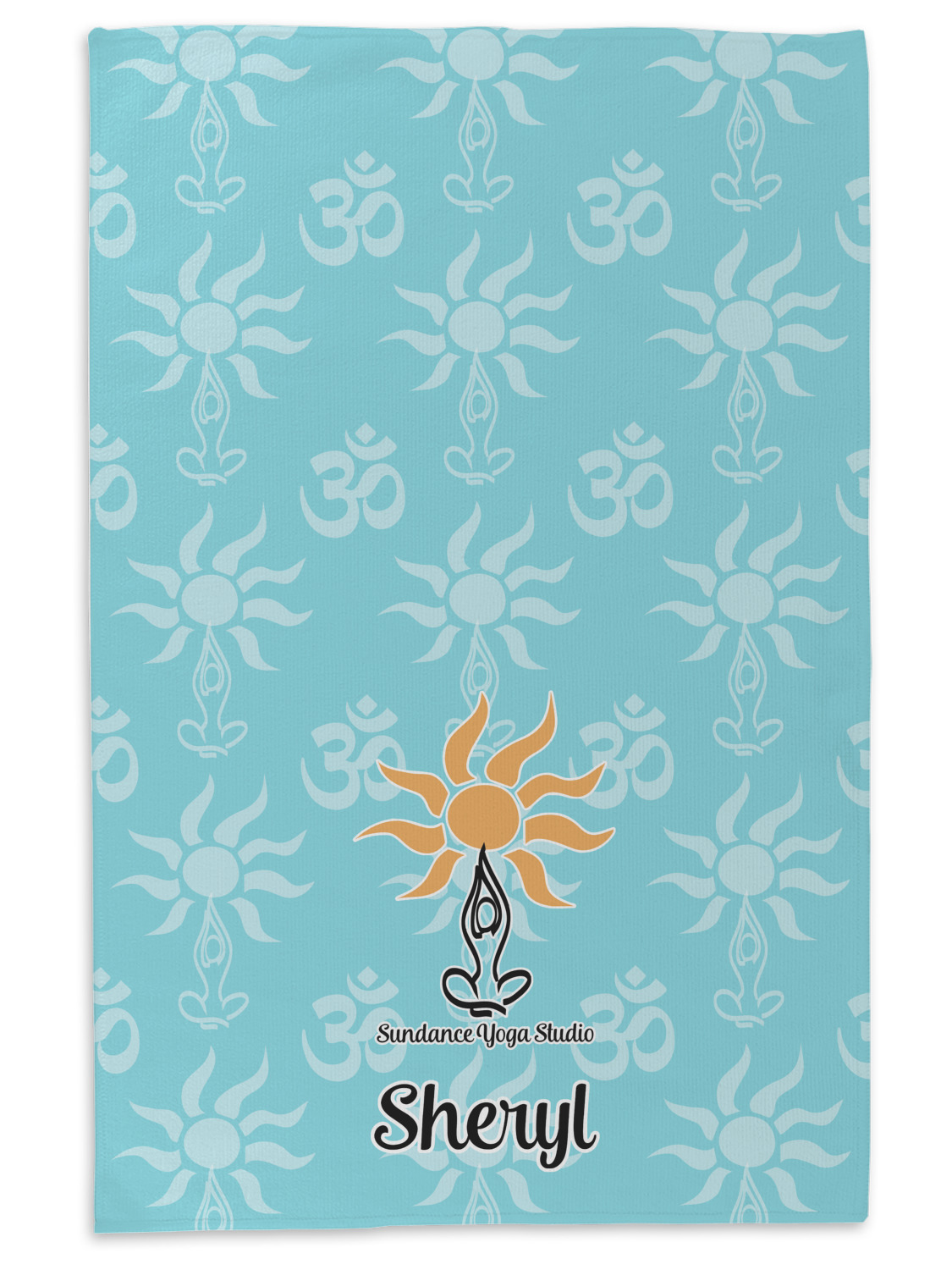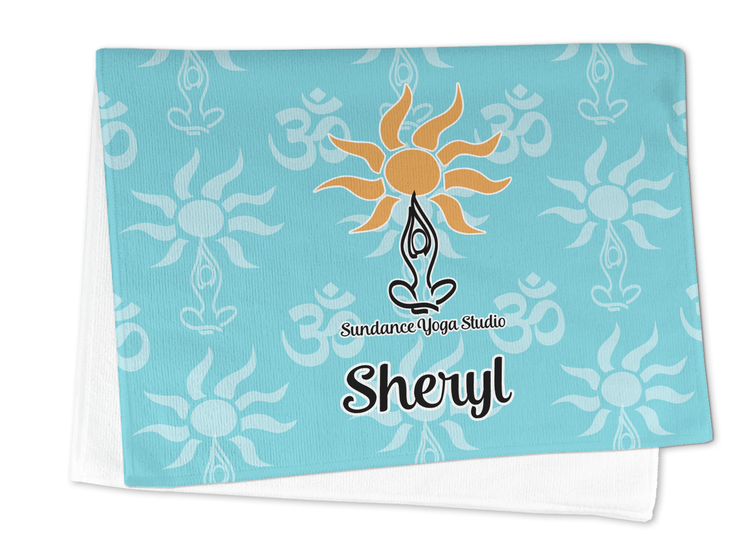 This calming design is dominantly a gorgeous light teal with the the Sundance logo, as well as the om symbol, repeating in the background. The main logo is prominently displayed front and center. The logo is a simple drawing of a figure doing the lotus pose with a sun rising above them. "Sundance Yoga Studio" is written beneath the logo. You personalization goes directly under the logo to create a finished design.