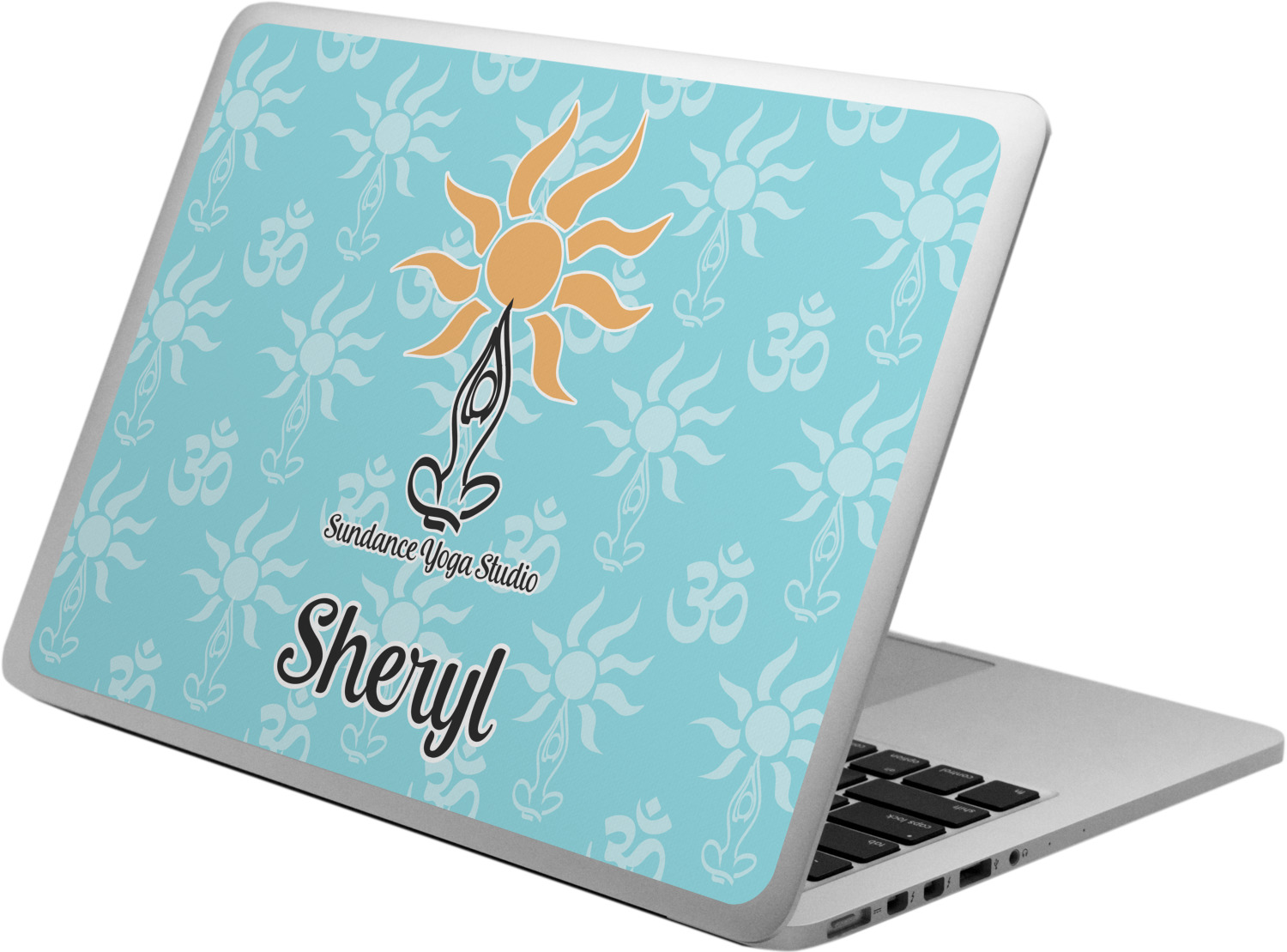 This calming design is dominantly a gorgeous light teal with the the Sundance logo, as well as the om symbol, repeating in the background. The main logo is prominently displayed front and center. The logo is a simple drawing of a figure doing the lotus pose with a sun rising above them. "Sundance Yoga Studio" is written beneath the logo. You personalization goes directly under the logo to create a finished design.