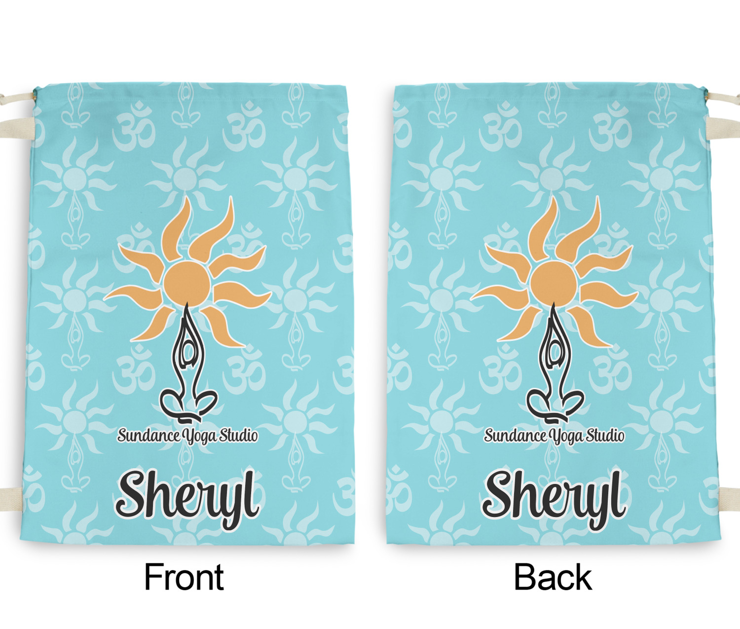 This calming design is dominantly a gorgeous light teal with the the Sundance logo, as well as the om symbol, repeating in the background. The main logo is prominently displayed front and center. The logo is a simple drawing of a figure doing the lotus pose with a sun rising above them. "Sundance Yoga Studio" is written beneath the logo. You personalization goes directly under the logo to create a finished design.