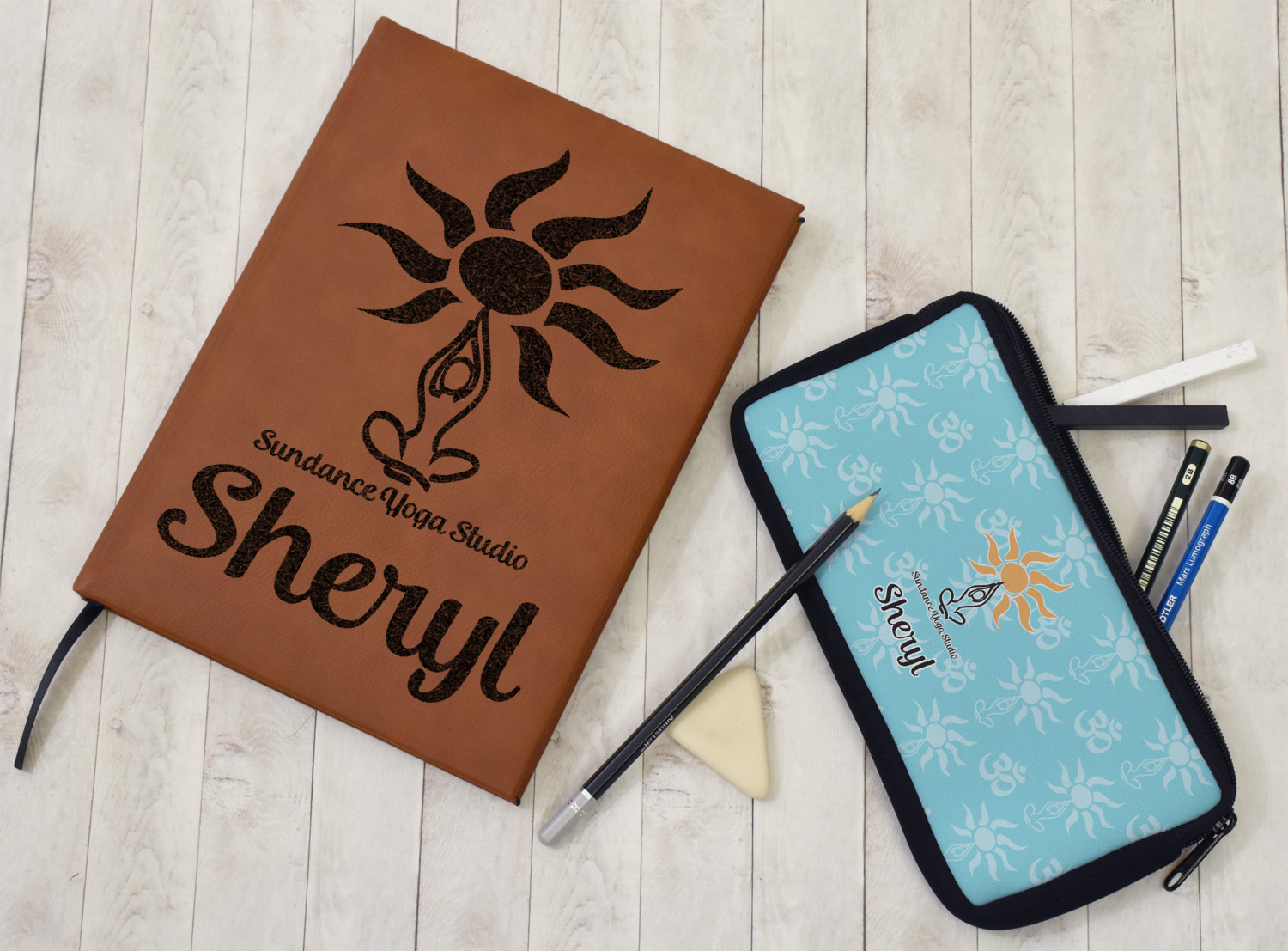 This calming design is dominantly a gorgeous light teal with the the Sundance logo, as well as the om symbol, repeating in the background. The main logo is prominently displayed front and center. The logo is a simple drawing of a figure doing the lotus pose with a sun rising above them. "Sundance Yoga Studio" is written beneath the logo. You personalization goes directly under the logo to create a finished design.