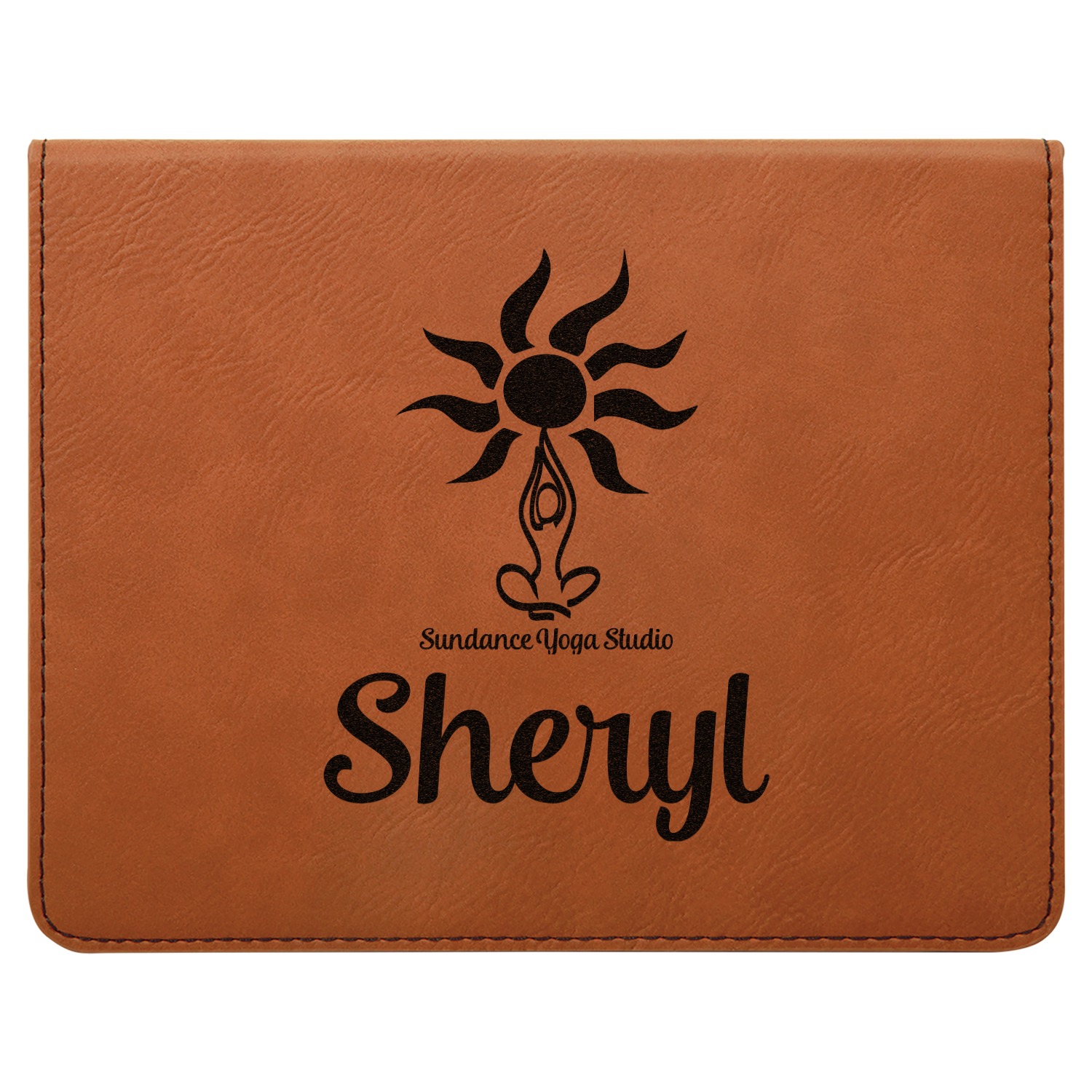 This calming design is dominantly a gorgeous light teal with the the Sundance logo, as well as the om symbol, repeating in the background. The main logo is prominently displayed front and center. The logo is a simple drawing of a figure doing the lotus pose with a sun rising above them. "Sundance Yoga Studio" is written beneath the logo. You personalization goes directly under the logo to create a finished design.