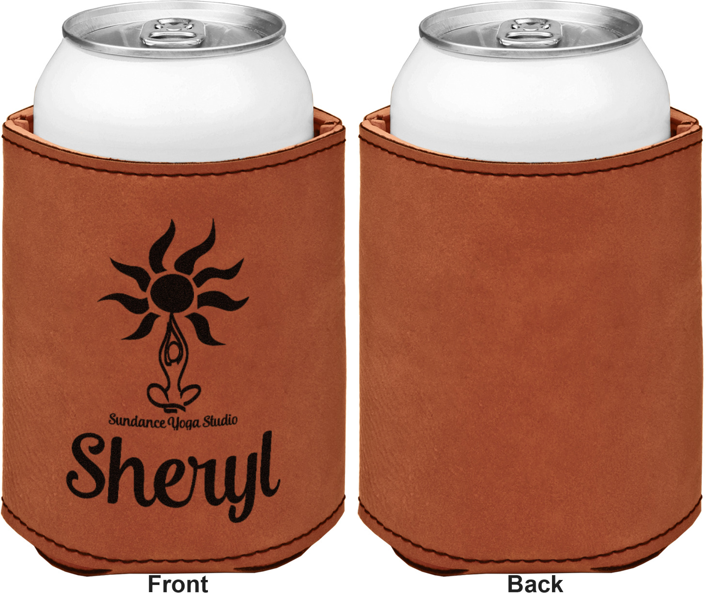 This can sleeve is made from a cognac-brown leatherette and stitched with a sturdy, black thread. A slim padding lines the inside of your can sleeve to allow for a better fit once your drink is inserted. The sleeve itself measures at 4 by 4.5 inches, allowing this custom can sleeve to accommodate most canned drinks. Your personalized design can be engraved on the front and back, or solely the front. When laser-engraved, your design appears as a black coloration which contrasts the leatherette nicely.