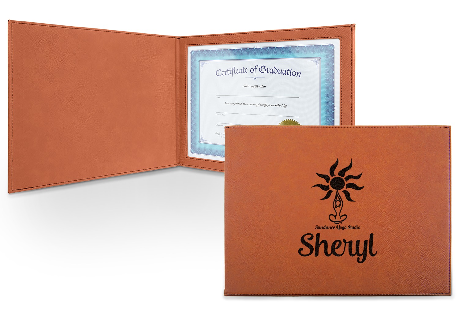 This cognac-colored, leatherette certificate jacket is the ideal way to display or store your hard-earned certificate. When closed, the custom certificate holder measures at 12 by 9 inches. The interior of the certificate cover includes a clear, vinyl window to encase your diploma. The window measures at around 10.5 by 7.5 inches and can accommodate a diploma that measures at up to 8.5 by 11 inches. You can either choose to have your customization laser engraved on the front and interior, or solely the front.