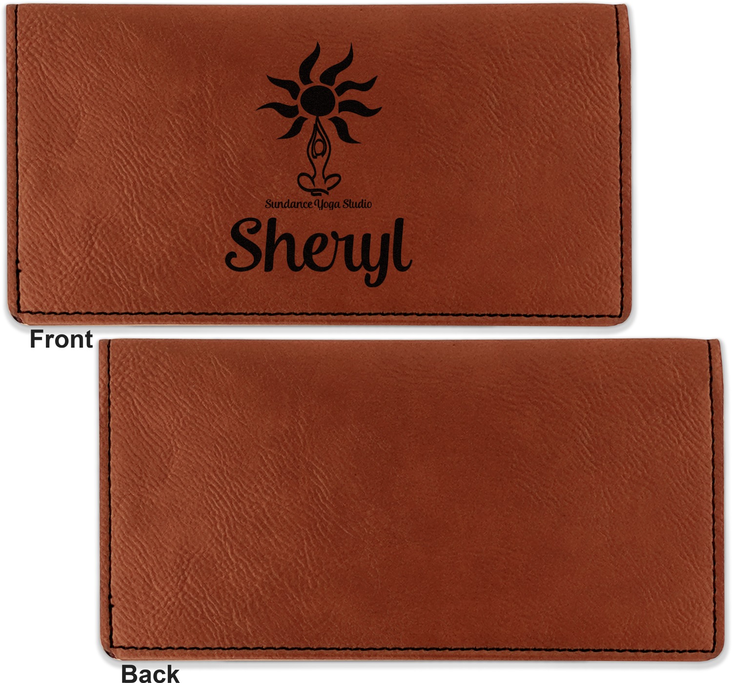 Go into our design center to start personalizing. Your checkbook cover will be laser engraved, making the graphic or text a black color. Choose a fun saying, monogram, or font to go on your checkbook cover. You have the opportunity to do it double or single sided.