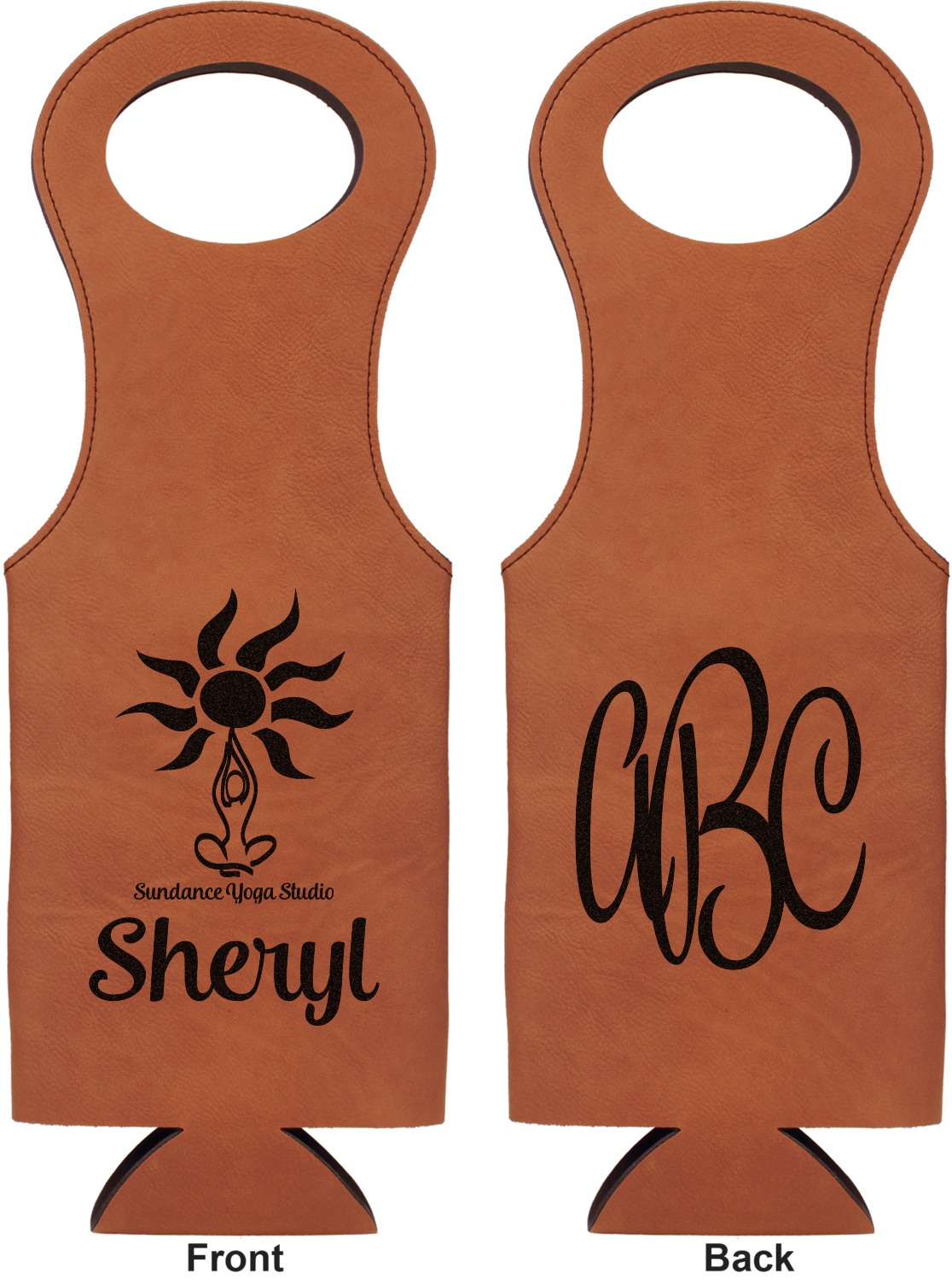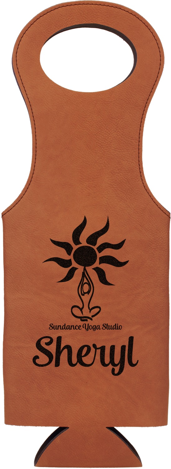 This wine carrier is made from a stunning leatherette, in a cognac-brown color. Strong, black stitching lines the sides of your wine bottle bag and provides extra durability. The interior is lined with a padded, black material to allow for a snug fit once your bottle is placed inside. At the top of this wine gift bag, you'll find two oval shaped handles that elegantly complements the rest of the bag's style. We provide you with the option of laser-engraving the front, or the front and back of your new personalized wine bag!