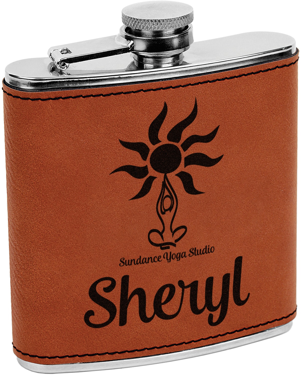 This custom flask is built from stainless steel, can hold 6 ounces, and is wrapped in a cognac-brown leatherette sleeve. The leatherette supplies a good grip on the liquor flask, while the slight curvature of the flask itself allows for a snug fit in your hand. Fine, black stitching lines the edges of the leatherette, adding to the durability of the material. This personalized flask features the traditional, screw and flip lid at its top, which prevents any unwanted spillage. Your customized design is precisely laser-engraved into the leatherette, leaving an elegant, dark-brown, almost black coloration.