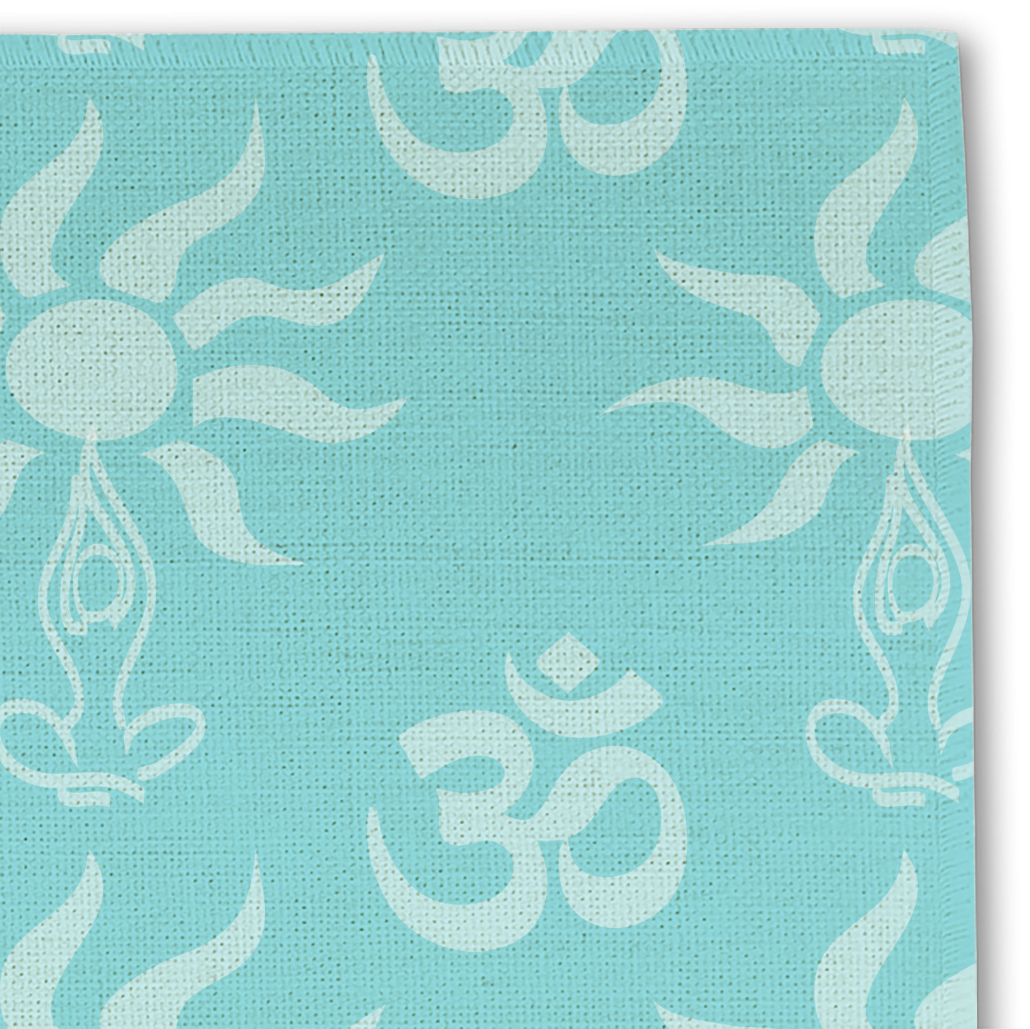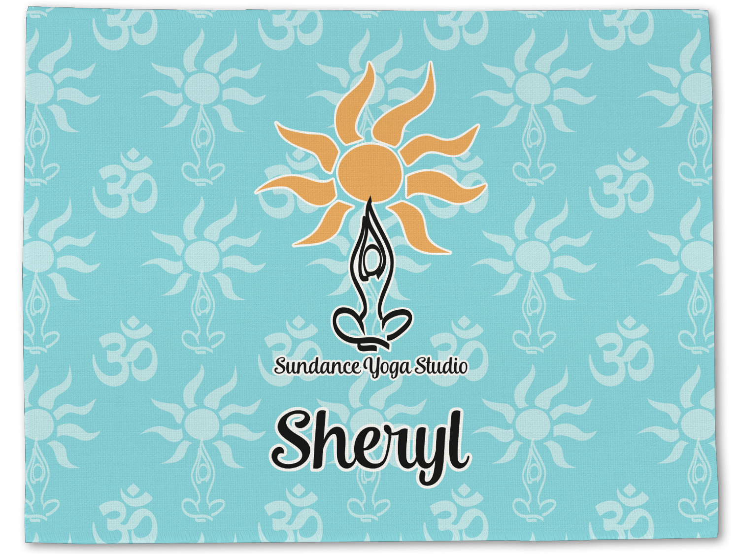 This calming design is dominantly a gorgeous light teal with the the Sundance logo, as well as the om symbol, repeating in the background. The main logo is prominently displayed front and center. The logo is a simple drawing of a figure doing the lotus pose with a sun rising above them. "Sundance Yoga Studio" is written beneath the logo. You personalization goes directly under the logo to create a finished design.