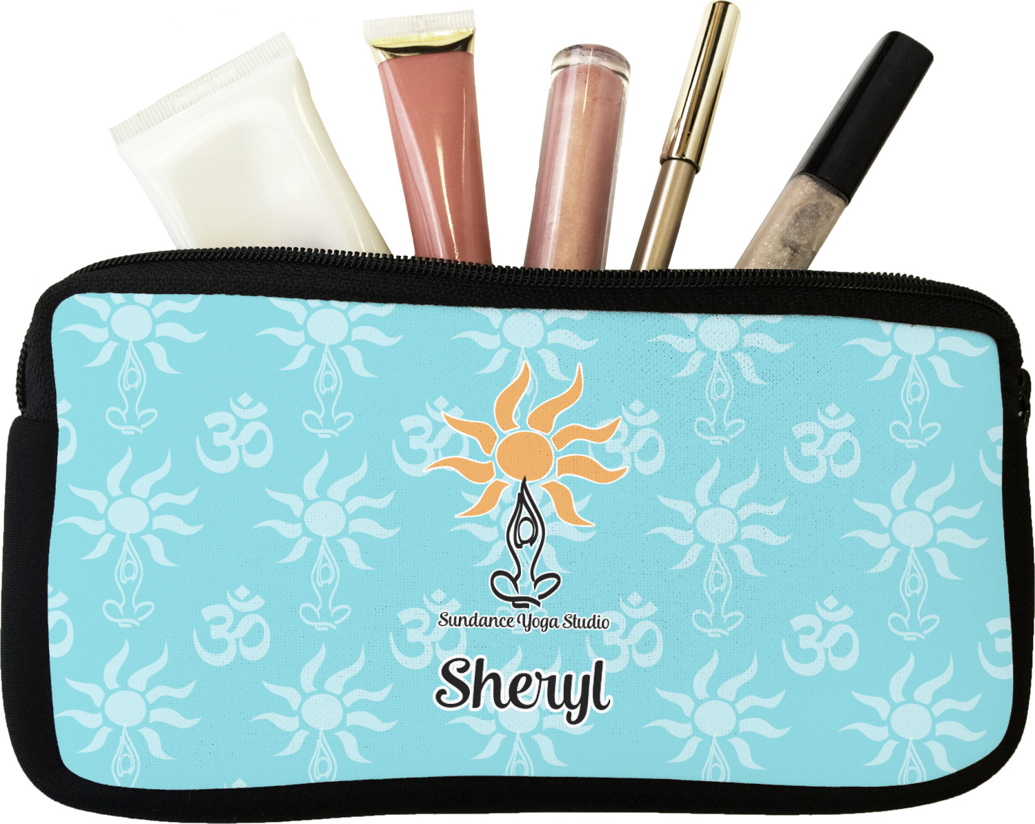 Our personalized makeup bags are available in many different designs, patterns and colors - so you are sure to find one that will love. They are made of neoprene (same material as wet-suits) and thus are water resistant, so spillages in your makeup bag will not end up all over you purse. They are customized on one side and are black on the other side and the zipper is black as well.