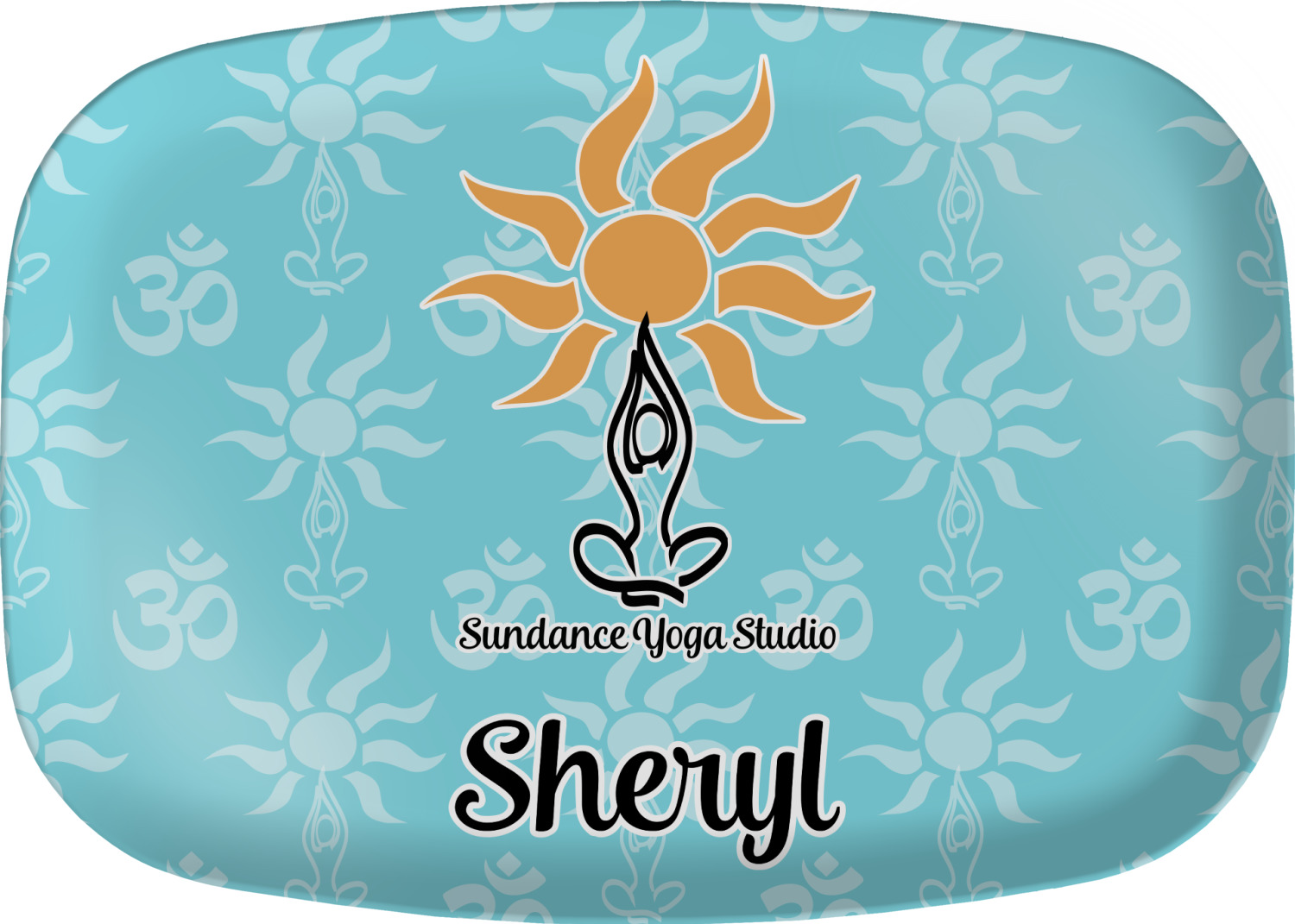 This calming design is dominantly a gorgeous light teal with the the Sundance logo, as well as the om symbol, repeating in the background. The main logo is prominently displayed front and center. The logo is a simple drawing of a figure doing the lotus pose with a sun rising above them. "Sundance Yoga Studio" is written beneath the logo. You personalization goes directly under the logo to create a finished design.