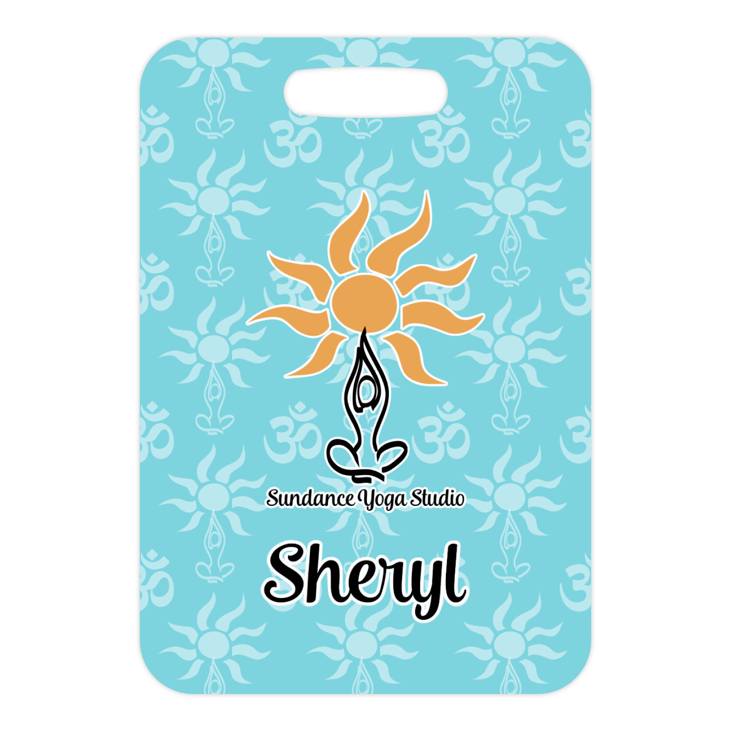 This calming design is dominantly a gorgeous light teal with the the Sundance logo, as well as the om symbol, repeating in the background. The main logo is prominently displayed front and center. The logo is a simple drawing of a figure doing the lotus pose with a sun rising above them. "Sundance Yoga Studio" is written beneath the logo. You personalization goes directly under the logo to create a finished design.