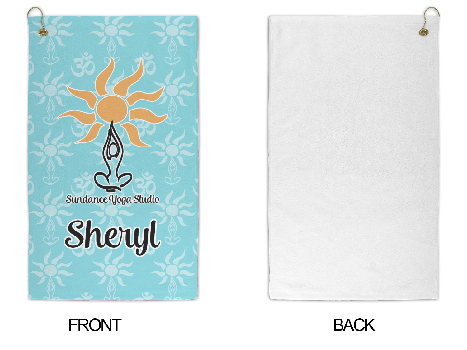 This calming design is dominantly a gorgeous light teal with the the Sundance logo, as well as the om symbol, repeating in the background. The main logo is prominently displayed front and center. The logo is a simple drawing of a figure doing the lotus pose with a sun rising above them. "Sundance Yoga Studio" is written beneath the logo. You personalization goes directly under the logo to create a finished design.