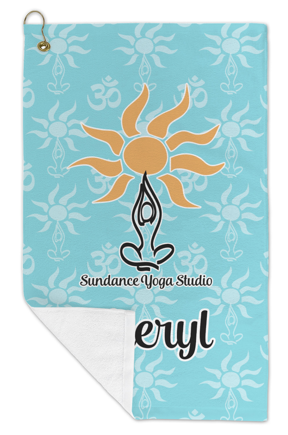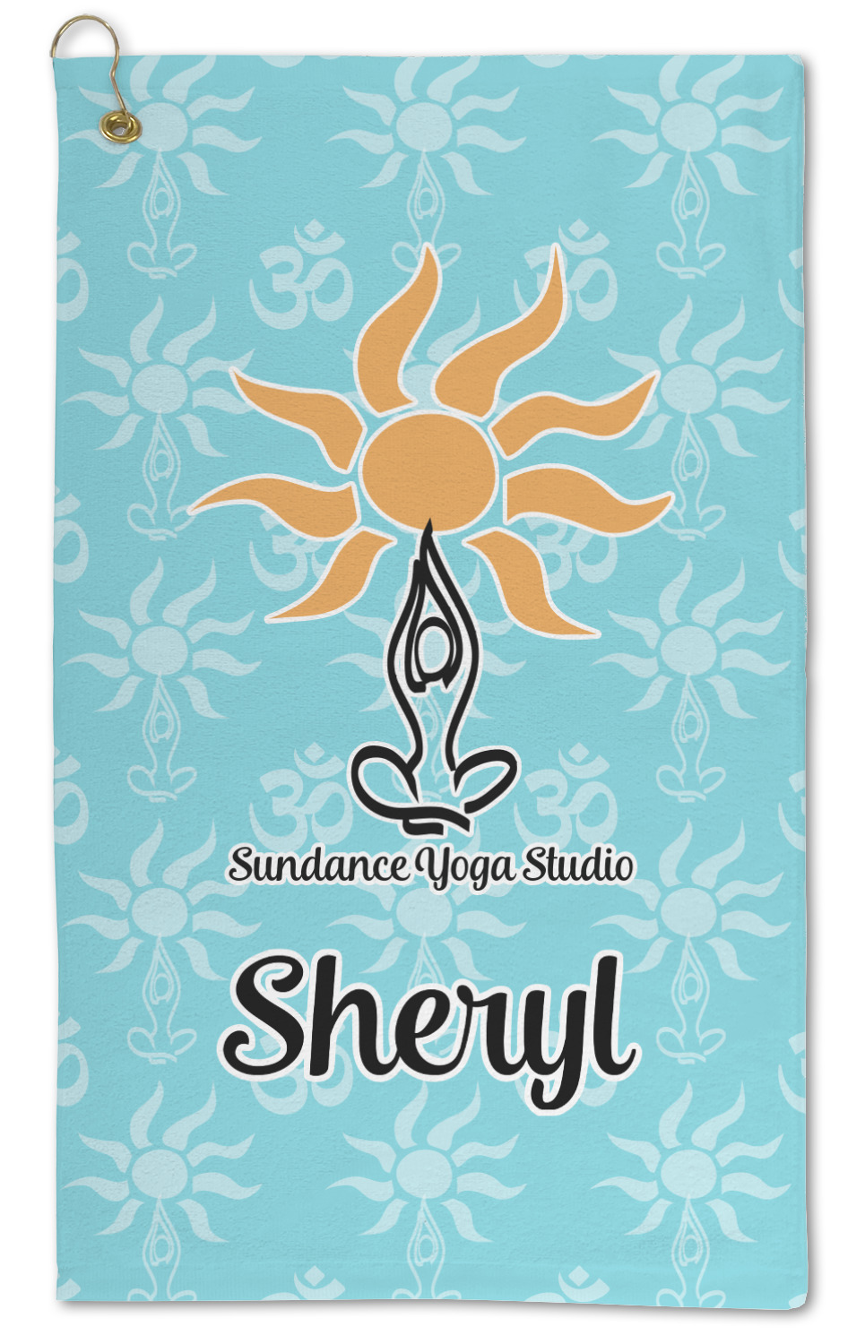 This calming design is dominantly a gorgeous light teal with the the Sundance logo, as well as the om symbol, repeating in the background. The main logo is prominently displayed front and center. The logo is a simple drawing of a figure doing the lotus pose with a sun rising above them. "Sundance Yoga Studio" is written beneath the logo. You personalization goes directly under the logo to create a finished design.