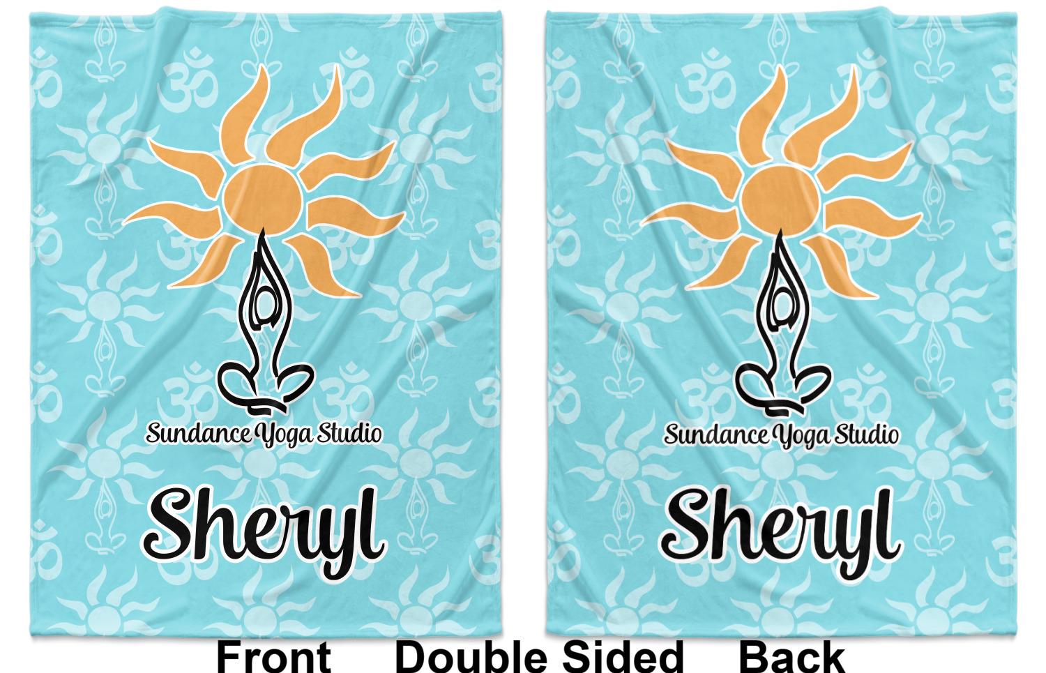 This calming design is dominantly a gorgeous light teal with the the Sundance logo, as well as the om symbol, repeating in the background. The main logo is prominently displayed front and center. The logo is a simple drawing of a figure doing the lotus pose with a sun rising above them. "Sundance Yoga Studio" is written beneath the logo. You personalization goes directly under the logo to create a finished design.