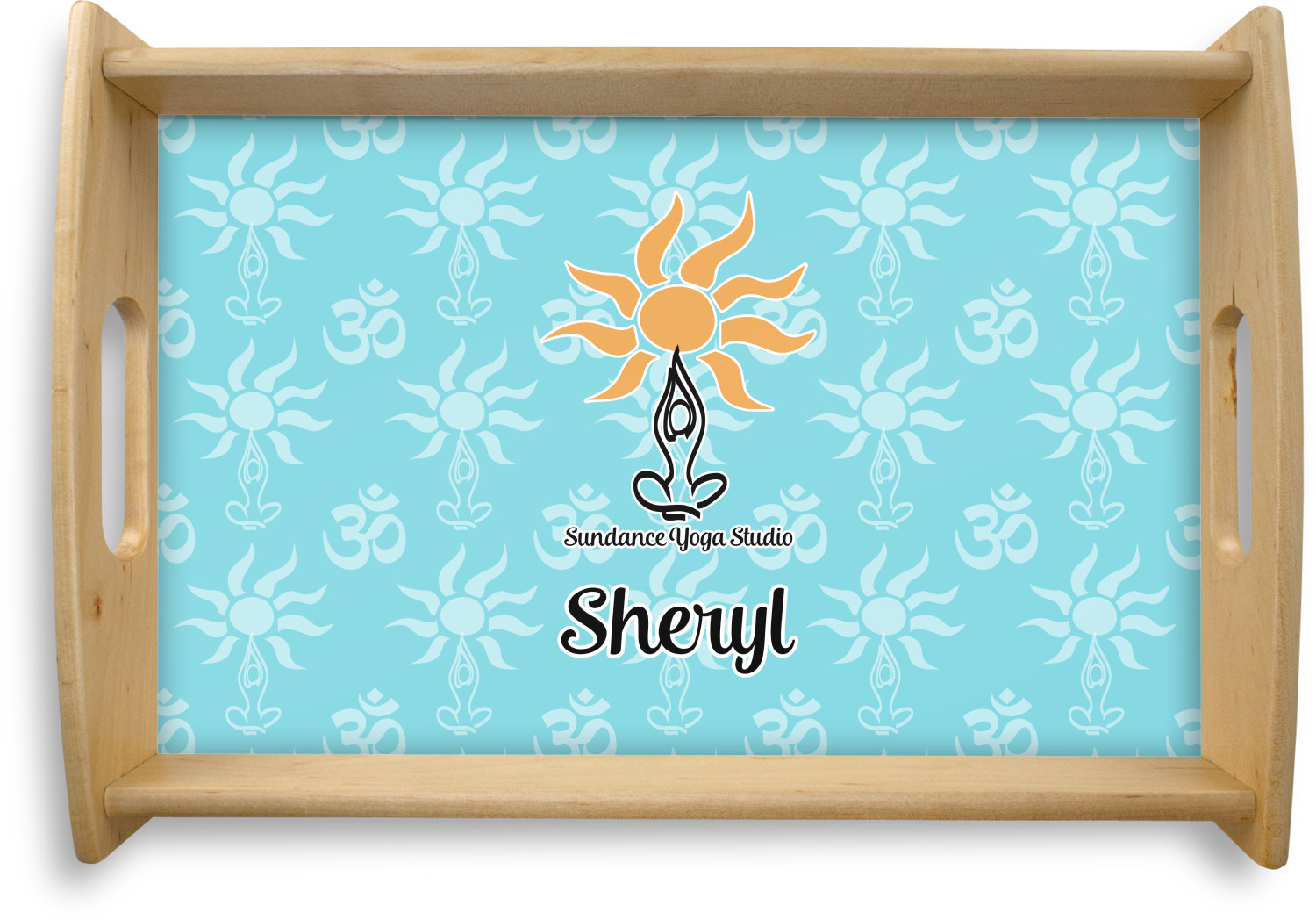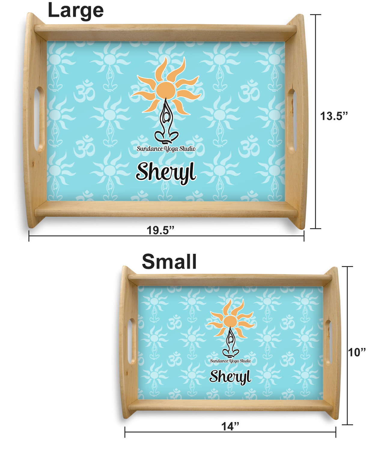 This serving tray with handles features square edges and two rounded sides, creating a very modern look. Each side is fabricated from a beautifully cut, natural wood. The bottom of the interior of the tray displays your customized design in bright, vibrant color. The tray is sold in both a black color and a natural wood look. Each variation of the wood serving tray has two sizes: Small, which is 14" x 10" x 2.25", and Large, which is 19.5" x 13.5" x 2.75".
