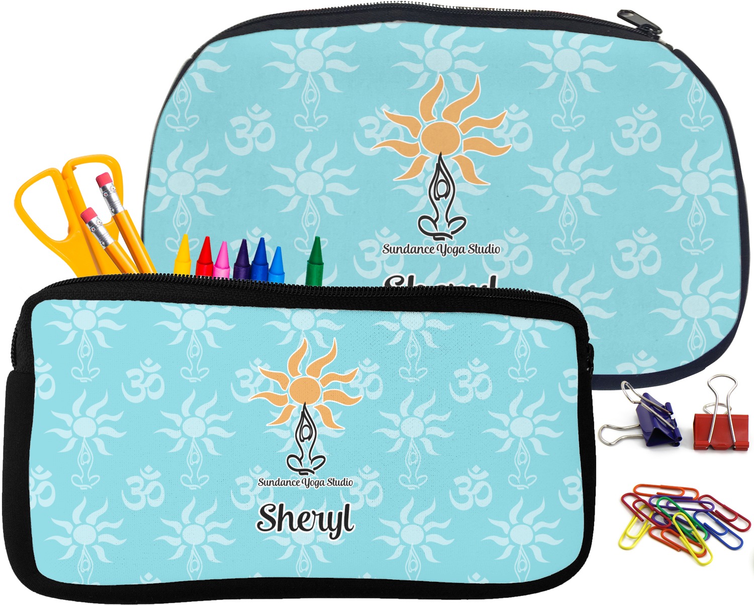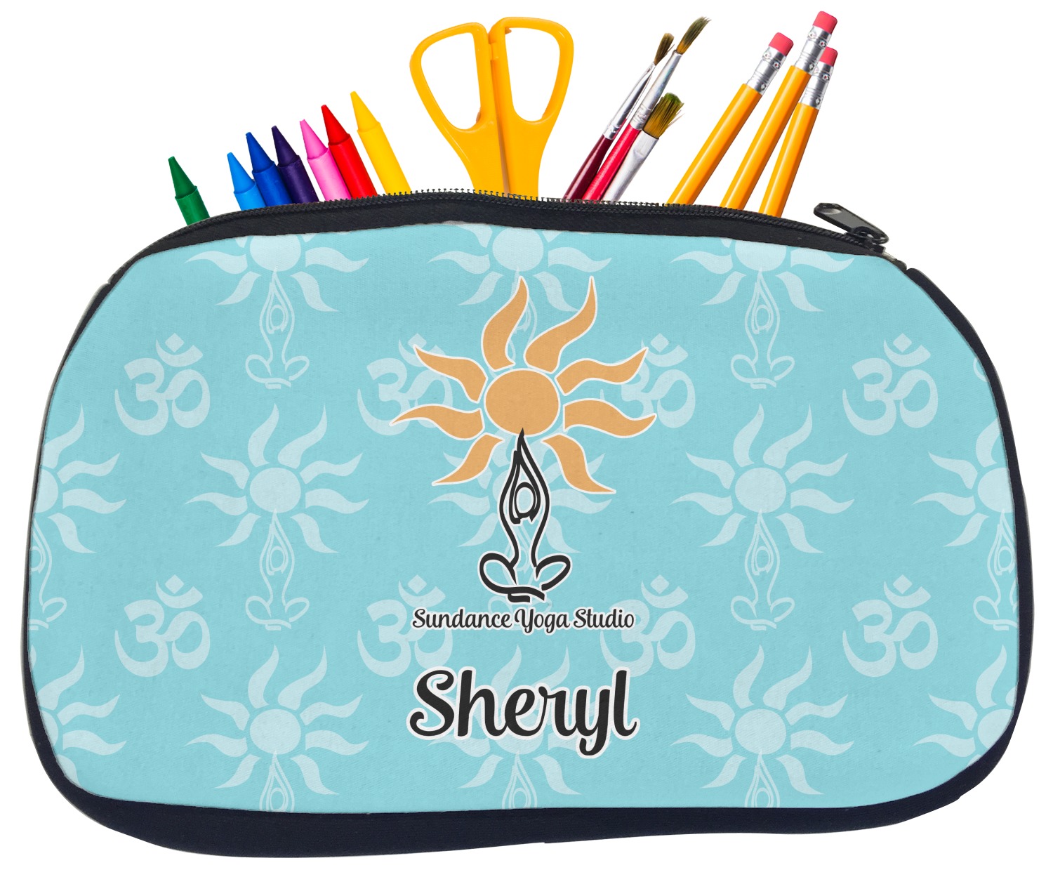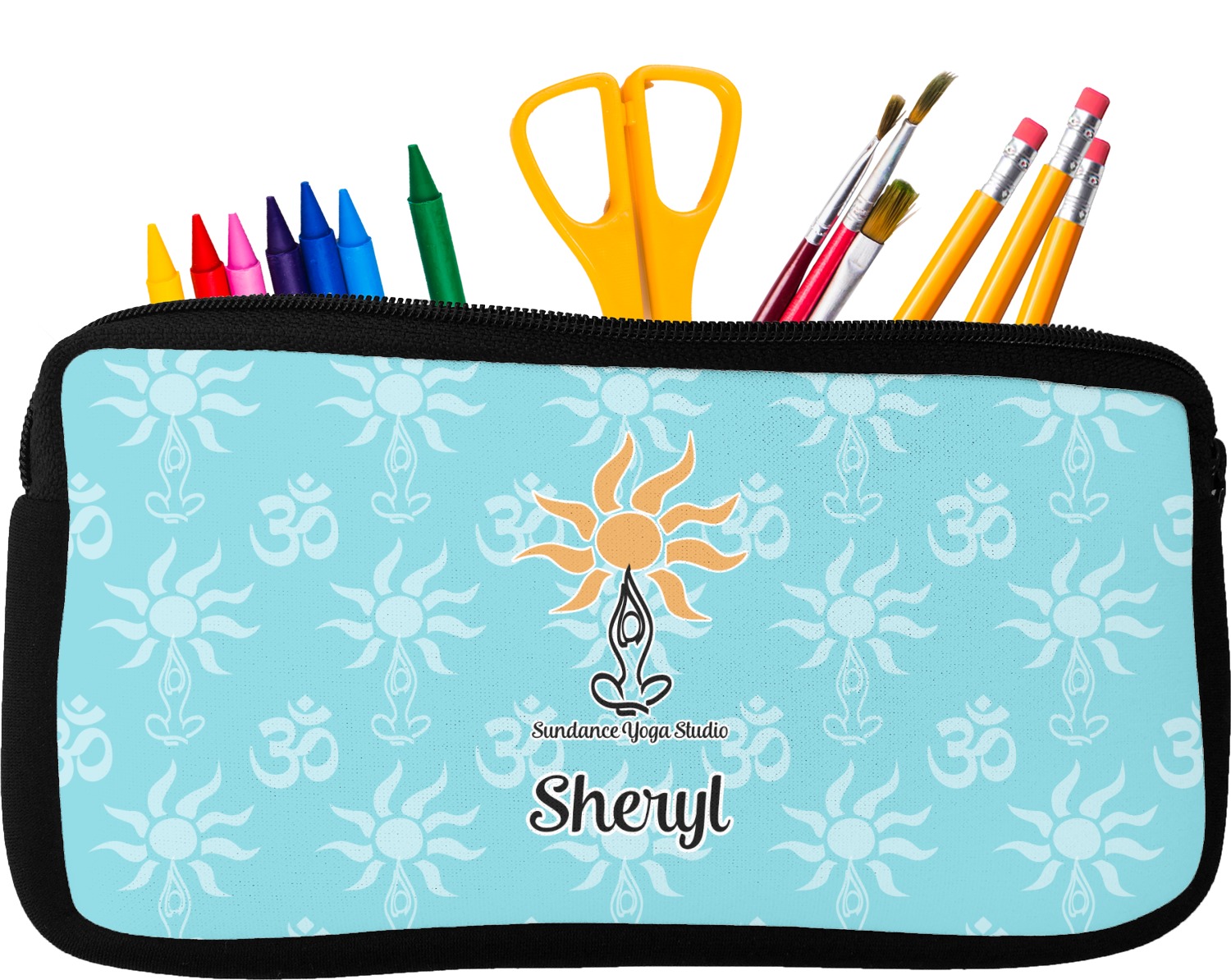 Built from durable neoprene, these pencil pouches, are water resistant, and prevent leaking ink from spilling into your backpack or purse. These custom pencil cases secure with a robust, black zipper. We print your personalized design on the front of this pouch, while the remaining sides a simple black color. These colored pencil cases [880] are sold in two sizes; our smaller version measures at 8.5 by 4.5 inches, while the medium measures at 10.5 by 6.5 inches. The smaller size is more suitable for holding pencils and pens, while our medium size can accommodate pencil sharpeners, scissors, and erasers.