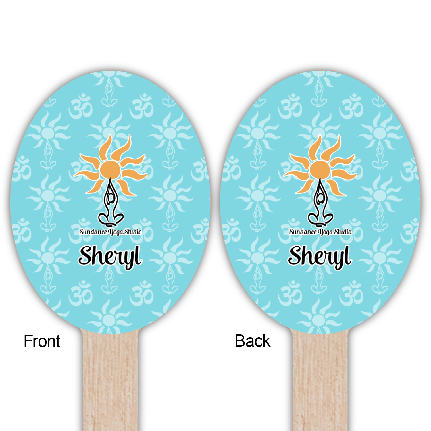 This calming design is dominantly a gorgeous light teal with the the Sundance logo, as well as the om symbol, repeating in the background. The main logo is prominently displayed front and center. The logo is a simple drawing of a figure doing the lotus pose with a sun rising above them. "Sundance Yoga Studio" is written beneath the logo. You personalization goes directly under the logo to create a finished design.