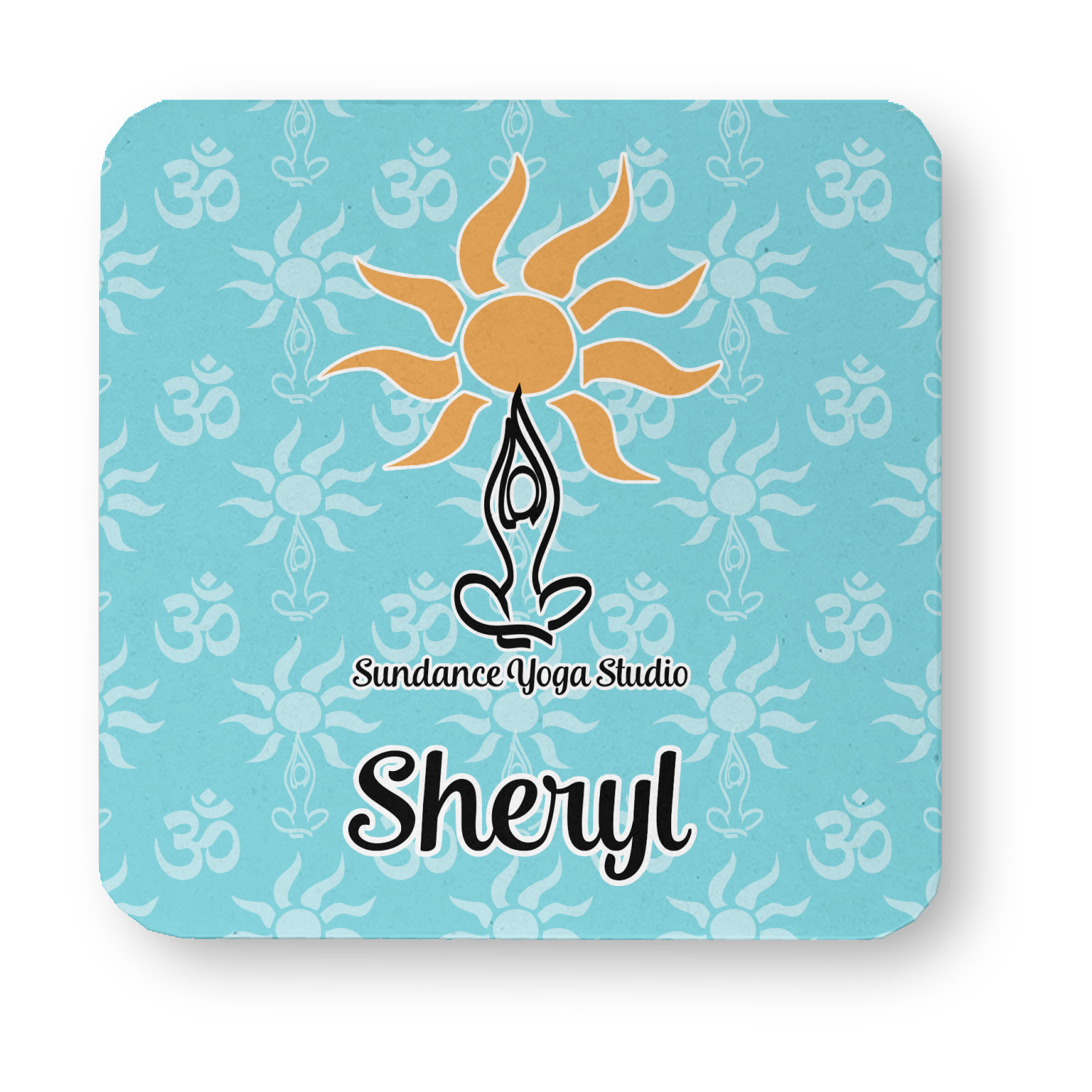 This calming design is dominantly a gorgeous light teal with the the Sundance logo, as well as the om symbol, repeating in the background. The main logo is prominently displayed front and center. The logo is a simple drawing of a figure doing the lotus pose with a sun rising above them. "Sundance Yoga Studio" is written beneath the logo. You personalization goes directly under the logo to create a finished design.