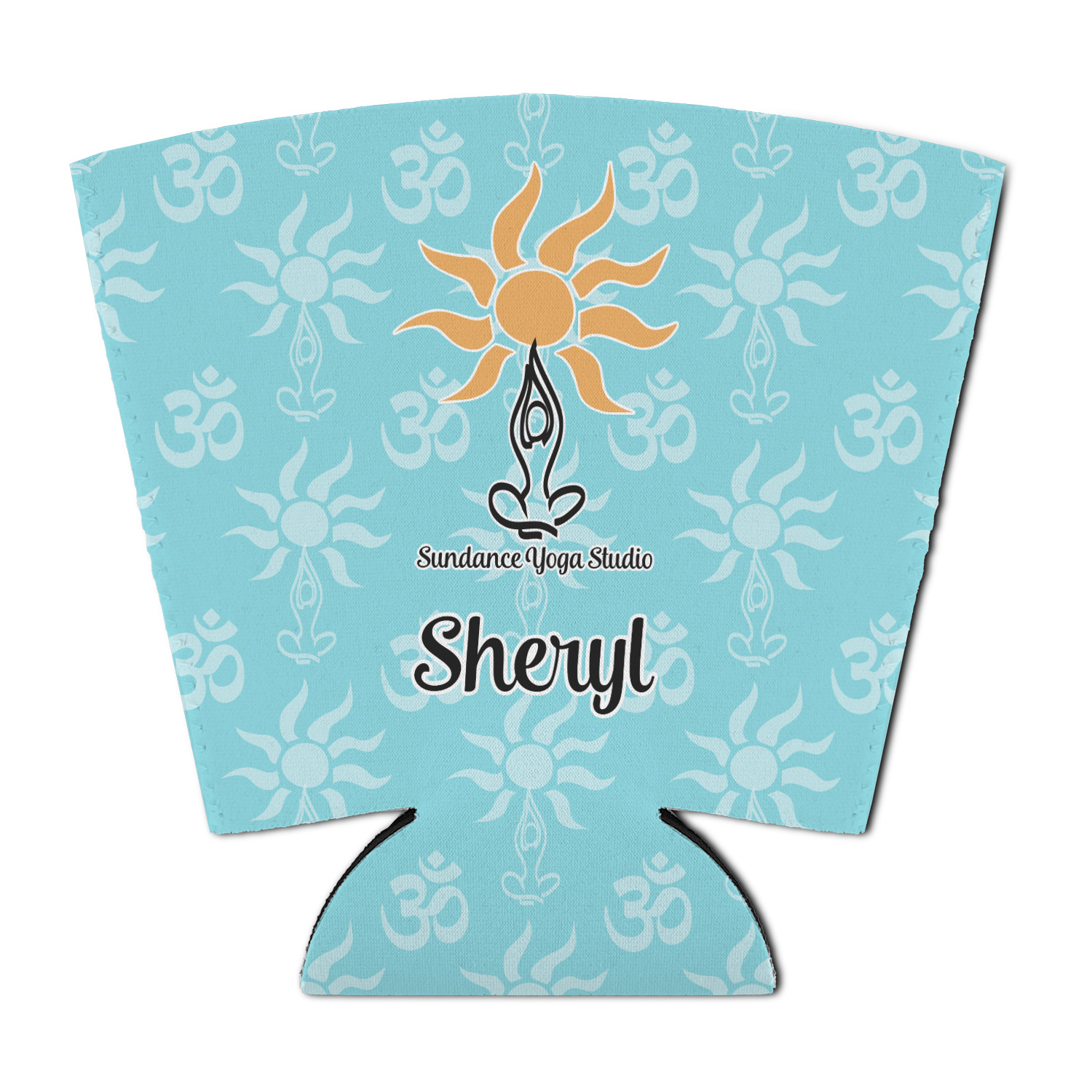 This calming design is dominantly a gorgeous light teal with the the Sundance logo, as well as the om symbol, repeating in the background. The main logo is prominently displayed front and center. The logo is a simple drawing of a figure doing the lotus pose with a sun rising above them. "Sundance Yoga Studio" is written beneath the logo. You personalization goes directly under the logo to create a finished design.