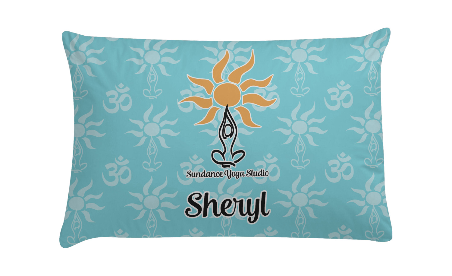 This calming design is dominantly a gorgeous light teal with the the Sundance logo, as well as the om symbol, repeating in the background. The main logo is prominently displayed front and center. The logo is a simple drawing of a figure doing the lotus pose with a sun rising above them. "Sundance Yoga Studio" is written beneath the logo. You personalization goes directly under the logo to create a finished design.