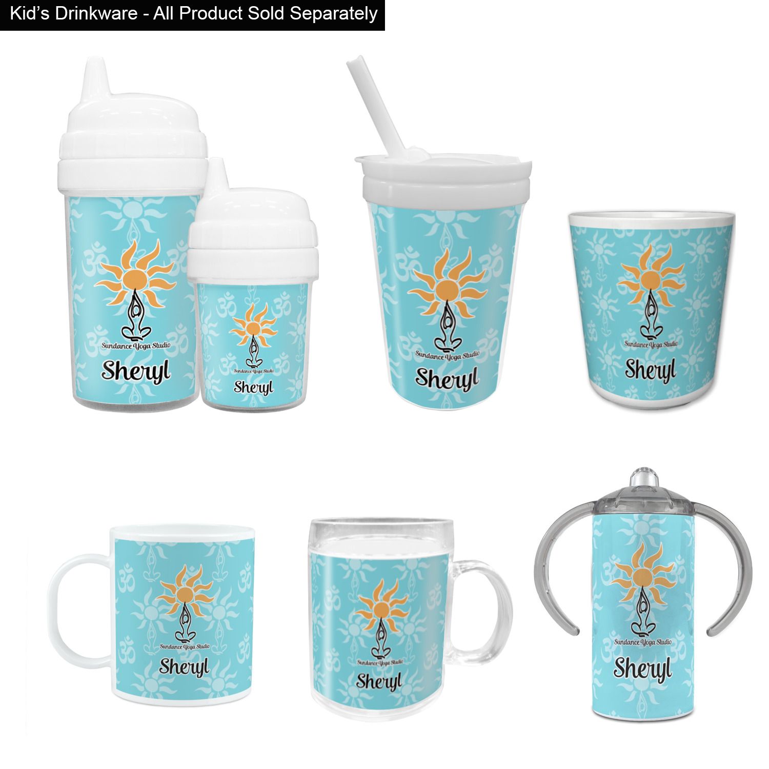 This calming design is dominantly a gorgeous light teal with the the Sundance logo, as well as the om symbol, repeating in the background. The main logo is prominently displayed front and center. The logo is a simple drawing of a figure doing the lotus pose with a sun rising above them. "Sundance Yoga Studio" is written beneath the logo. You personalization goes directly under the logo to create a finished design.
